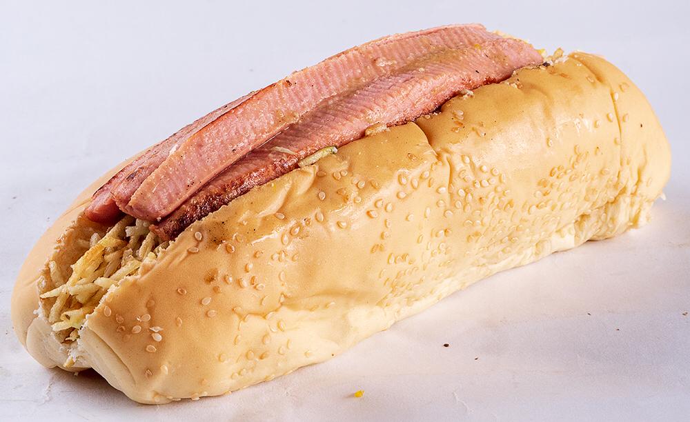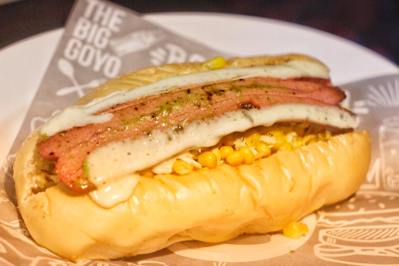 Platillo individual: Pan perro con salchicha suiza, queso costeño, papita chongo y salsa tártara.