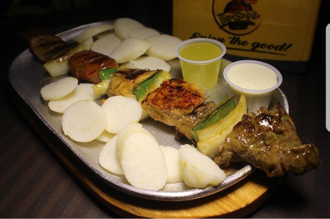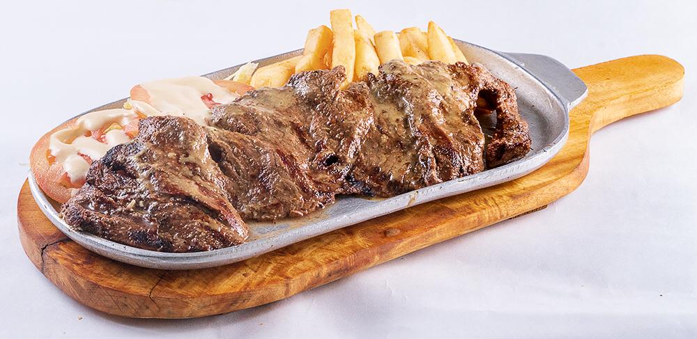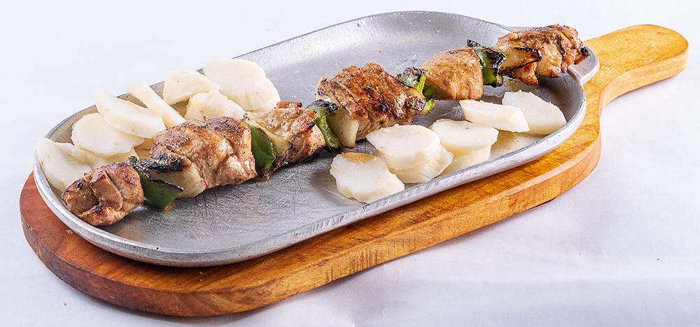 Chuzo Desgranado – Platillo individual: Mixto de pollo y carne con pimentón, cebolla grille, queso costeño, papita chongo y salsa tártara.