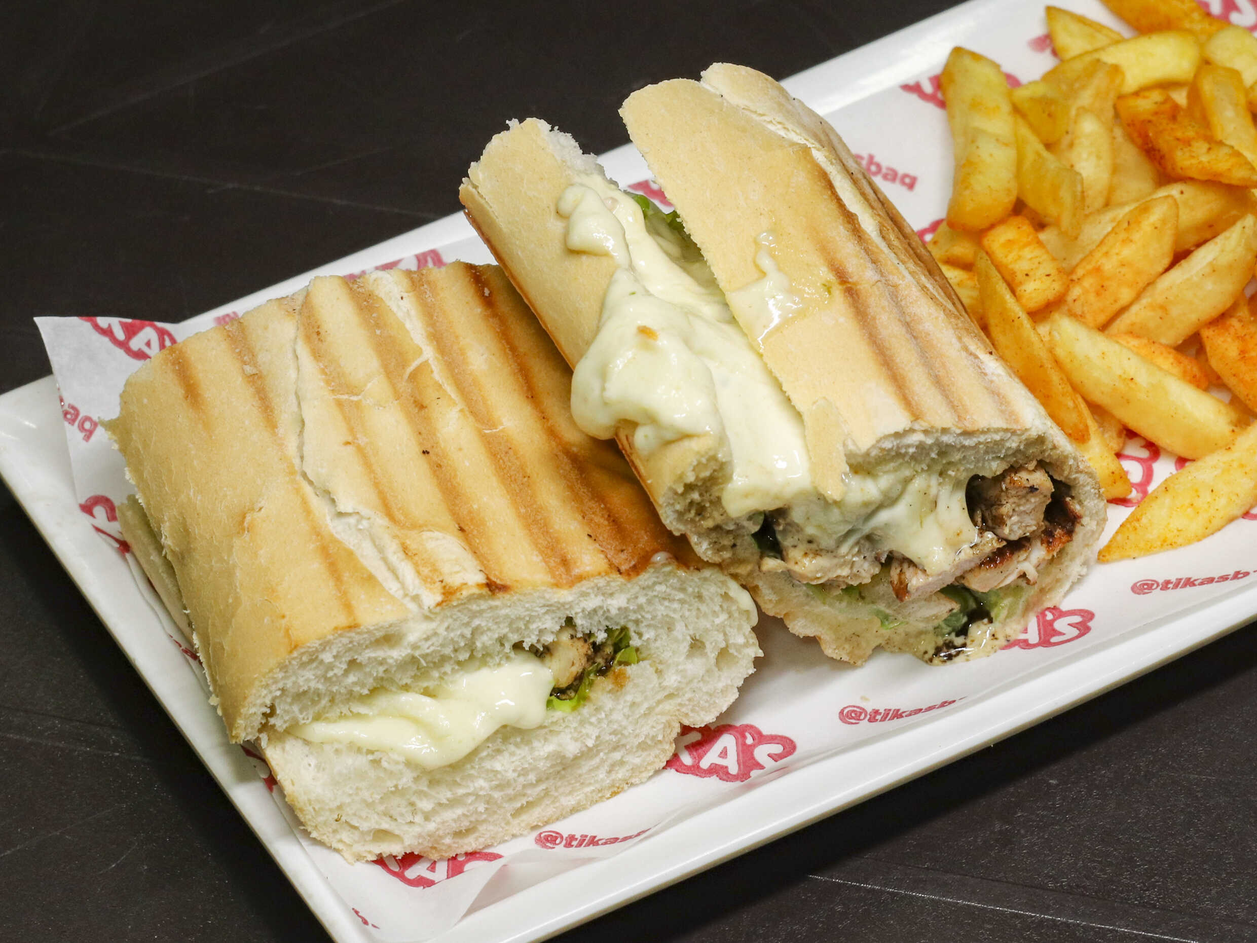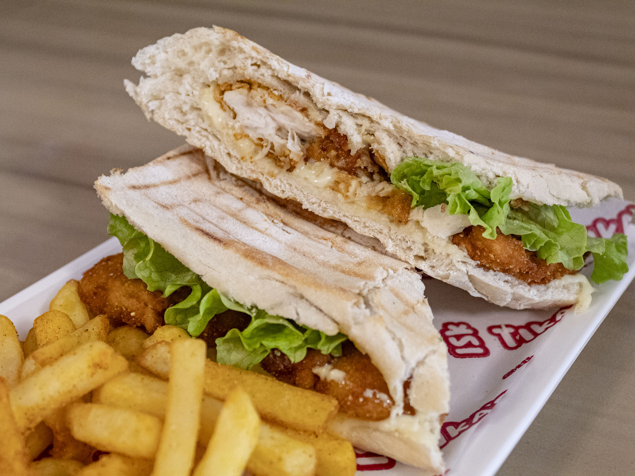 Pan artellano, pechuga de pollo, queso, lechuga, tomate y salsa de la casa, acompañado de papas a la francesa.