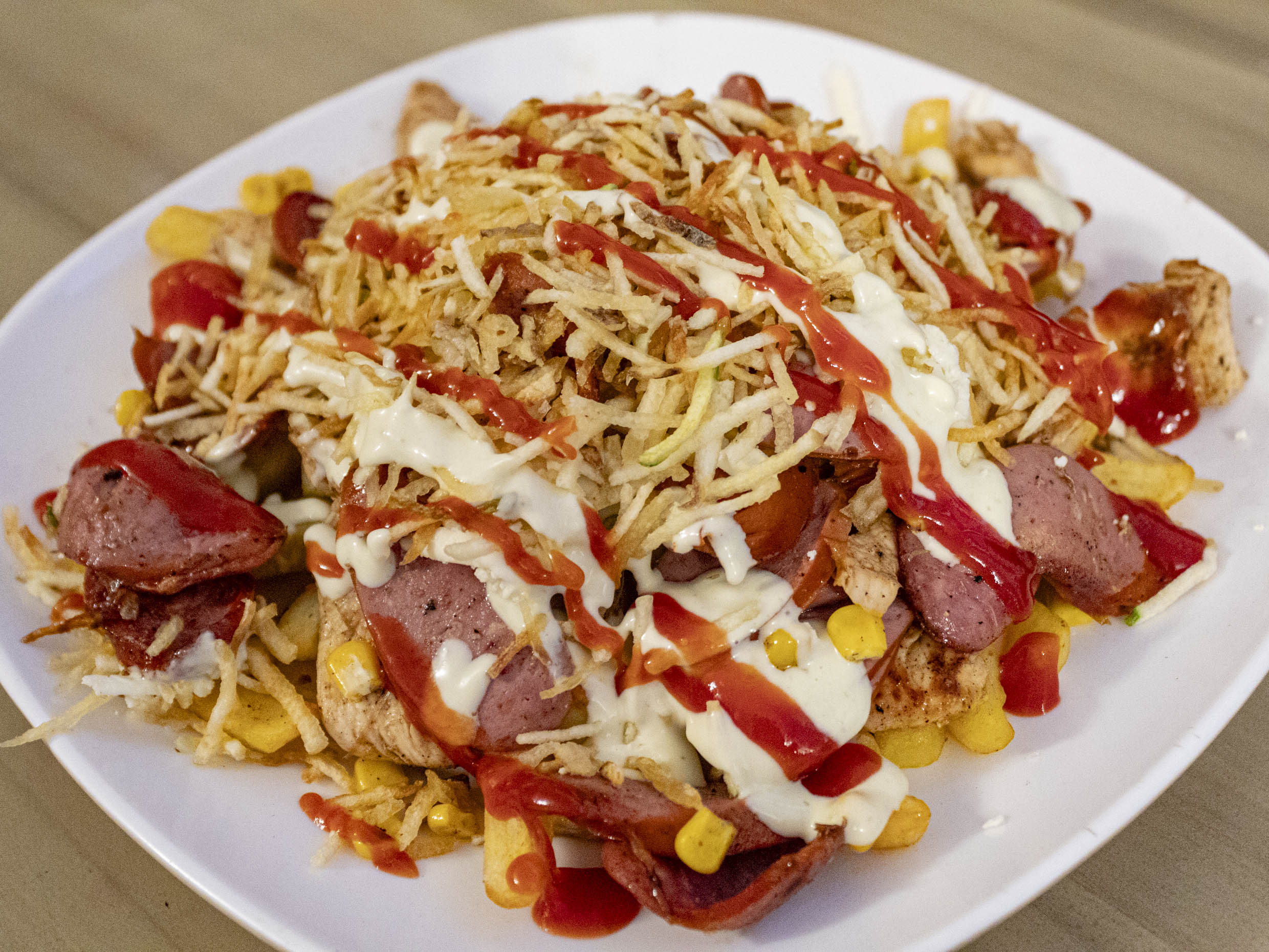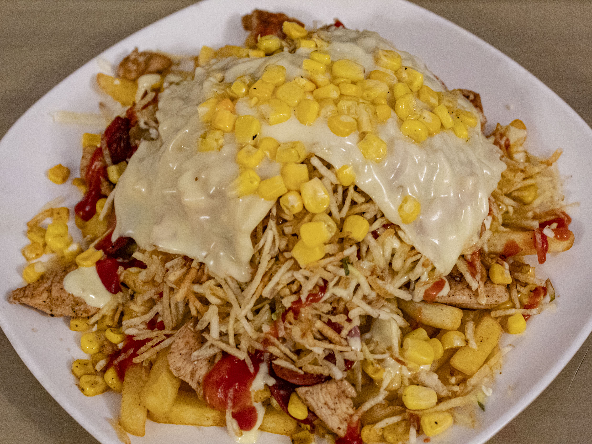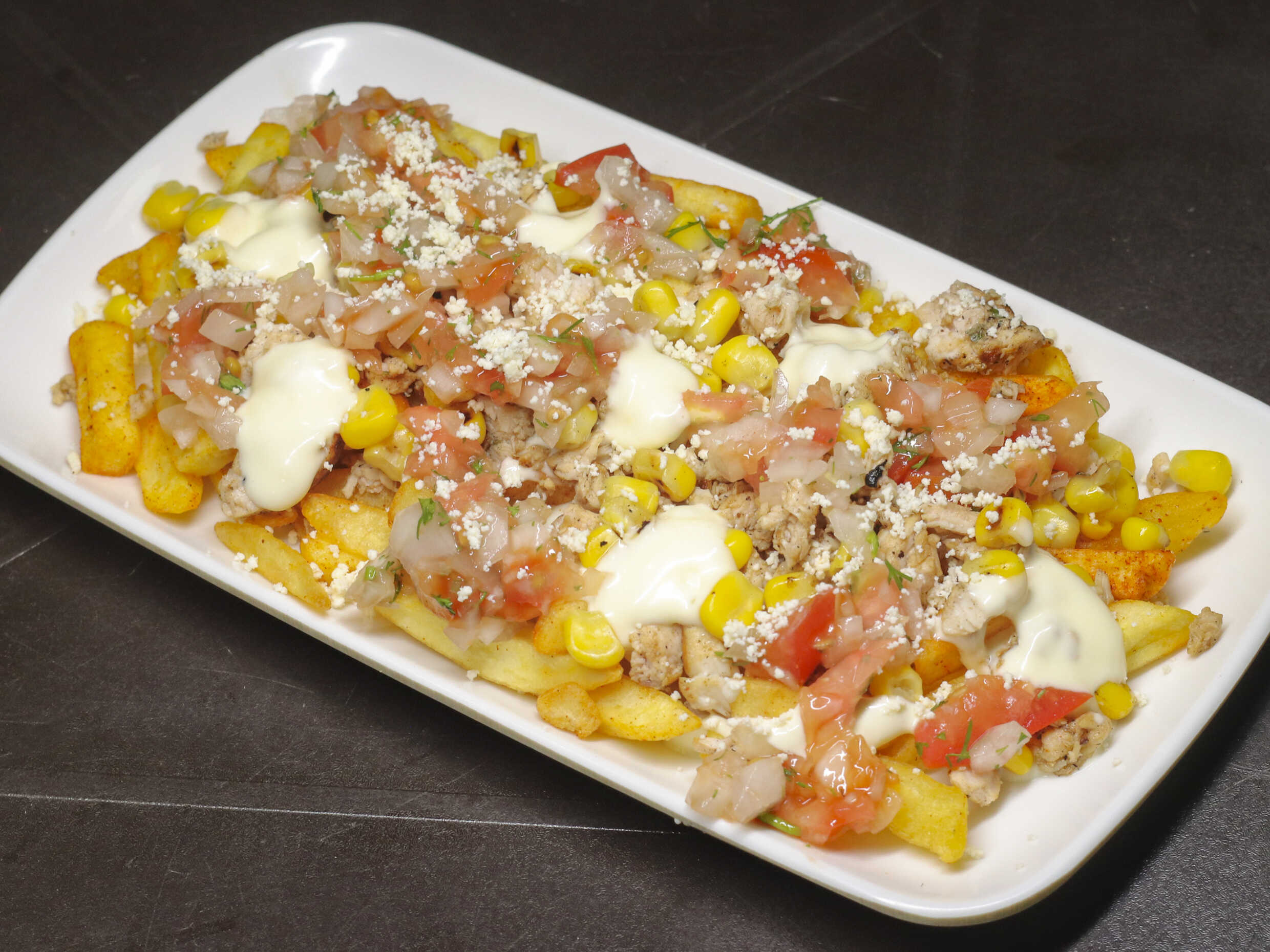 Papas a la francesa, maíz, pico de gallo, pechuga de pollo en cuadritos o carne desmechada, queso crema y queso.