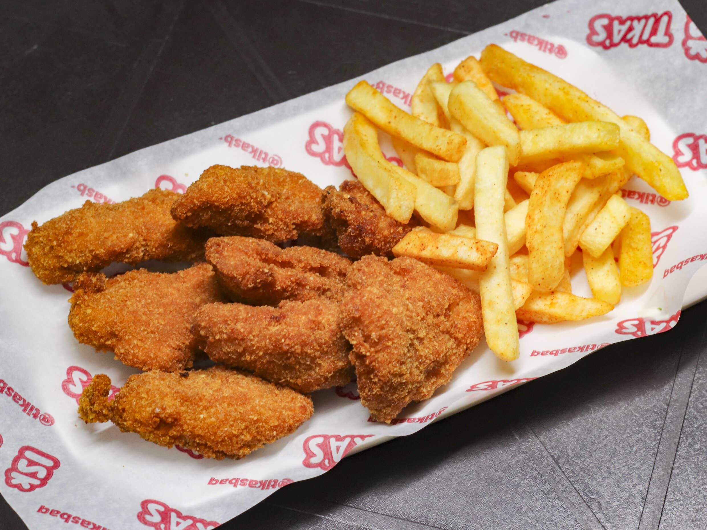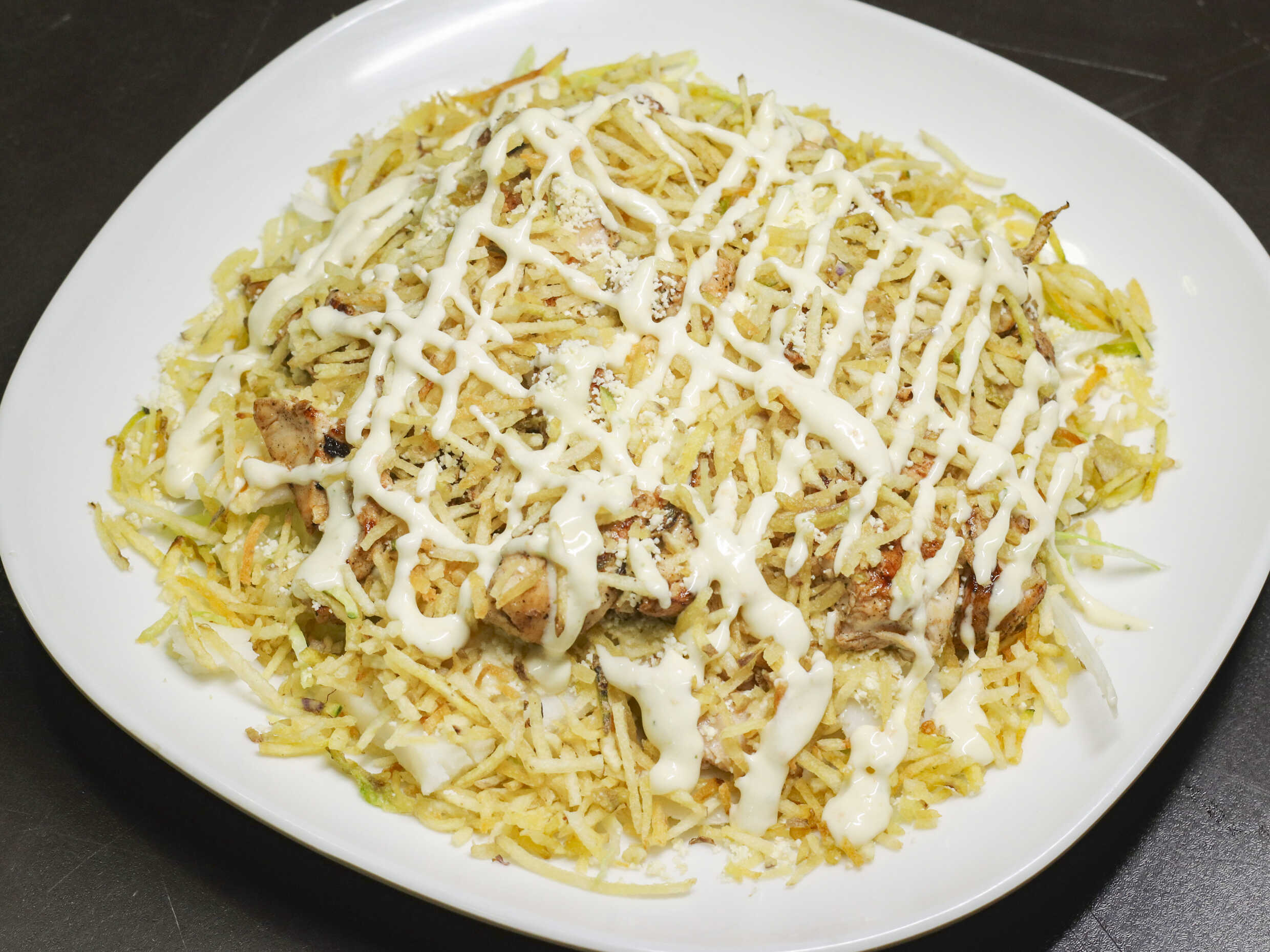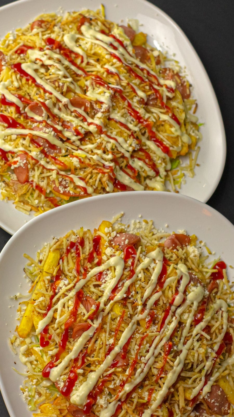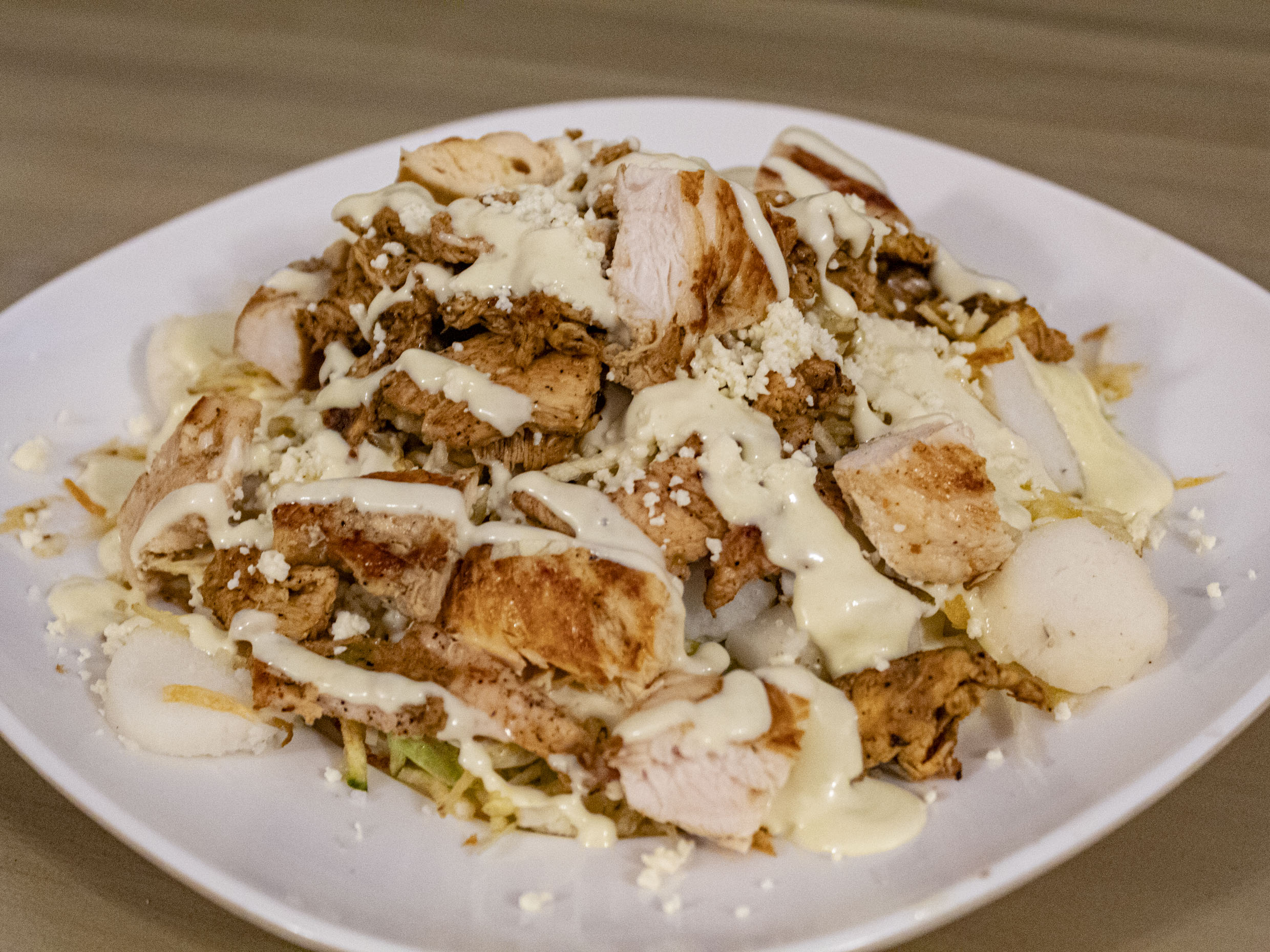 Papas a la francesa, maíz, pico de gallo, pechuga de pollo en cuadritos o carne desmechada, queso crema y queso.