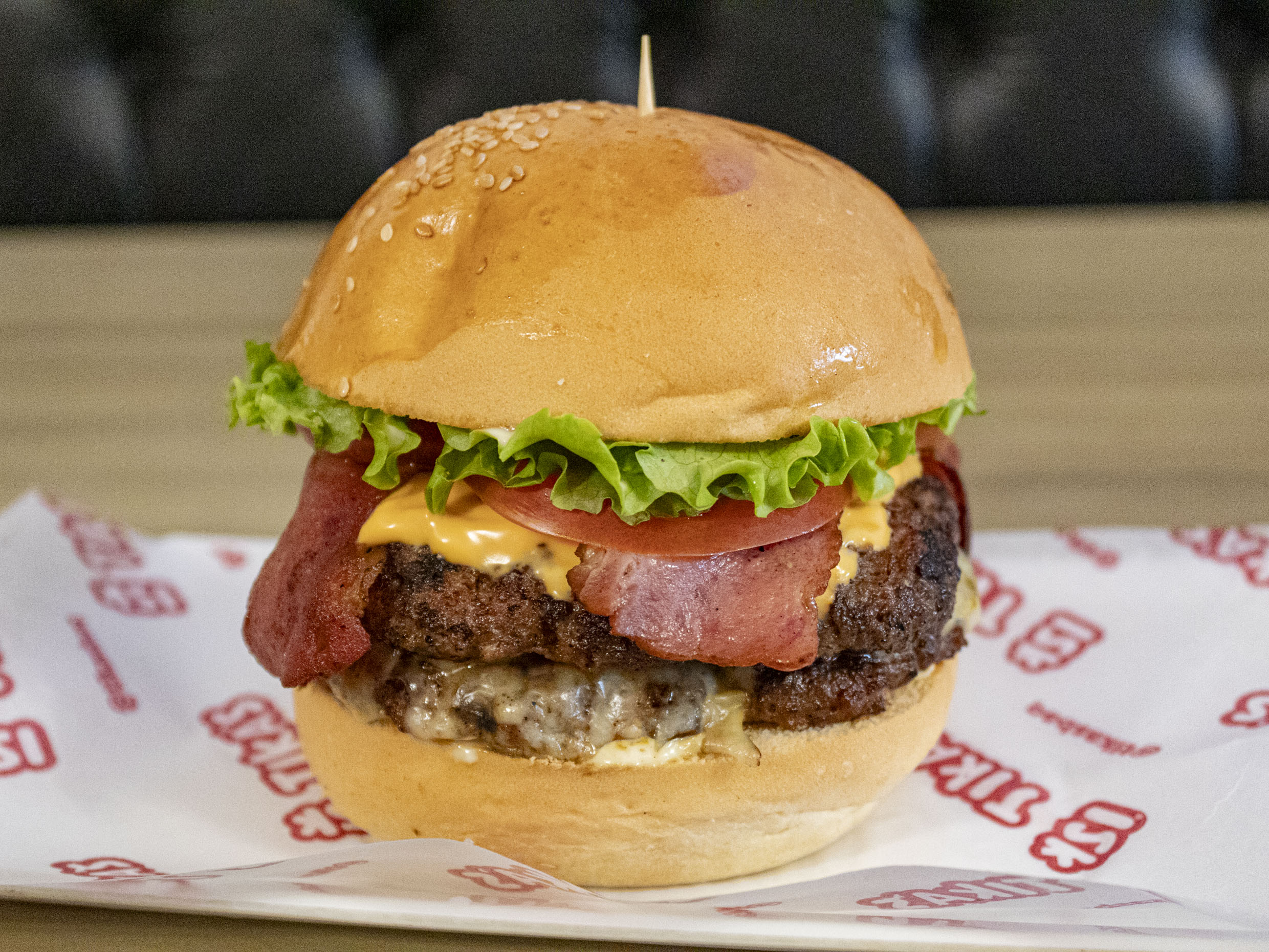 Carne de res 100 % nacional (340 g), queso mozzarella, queso cheddar, tocineta, lechuga, tomate, cebolla grillé y salsas de la casa, acompañada de papas a elección.