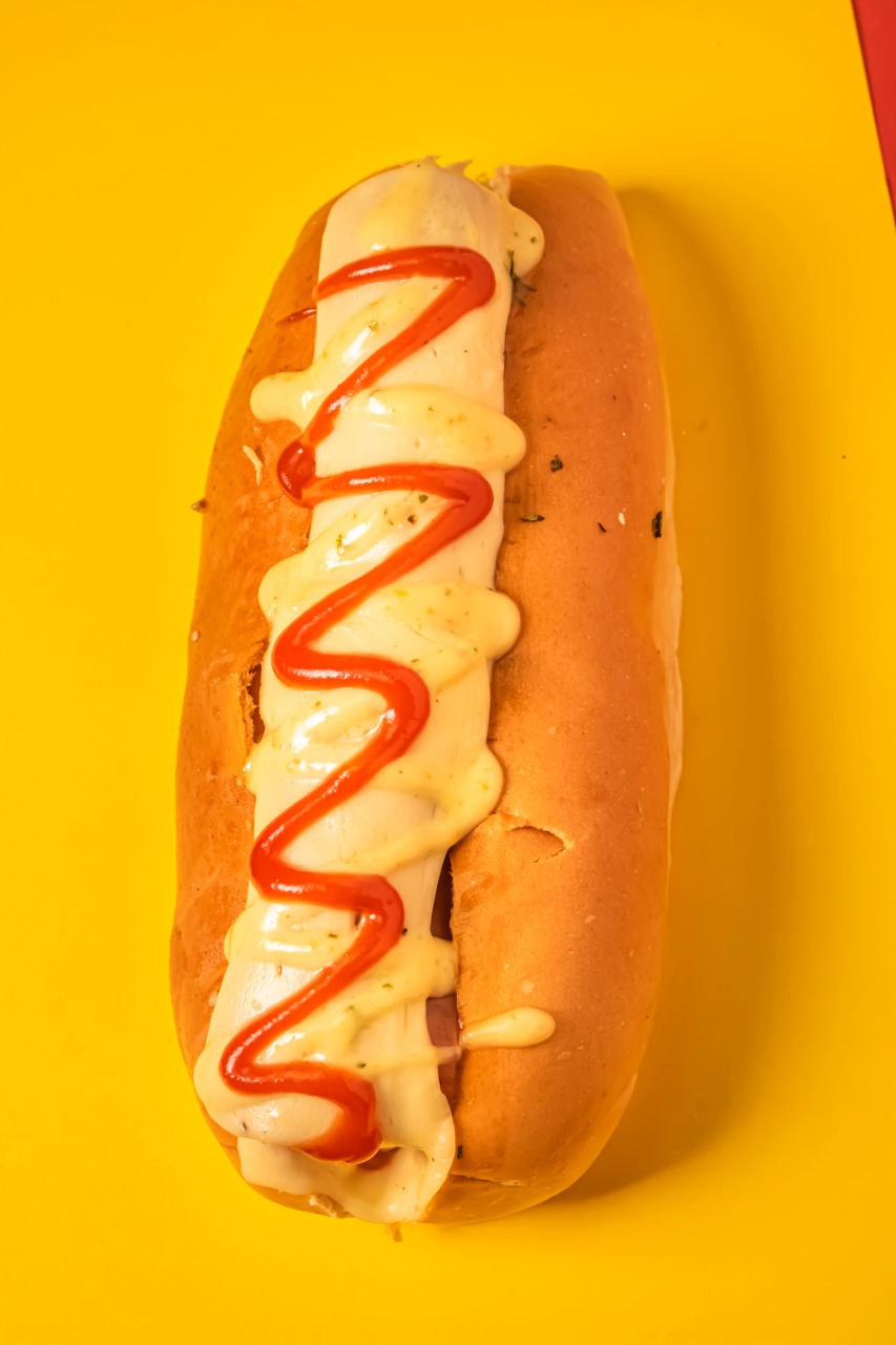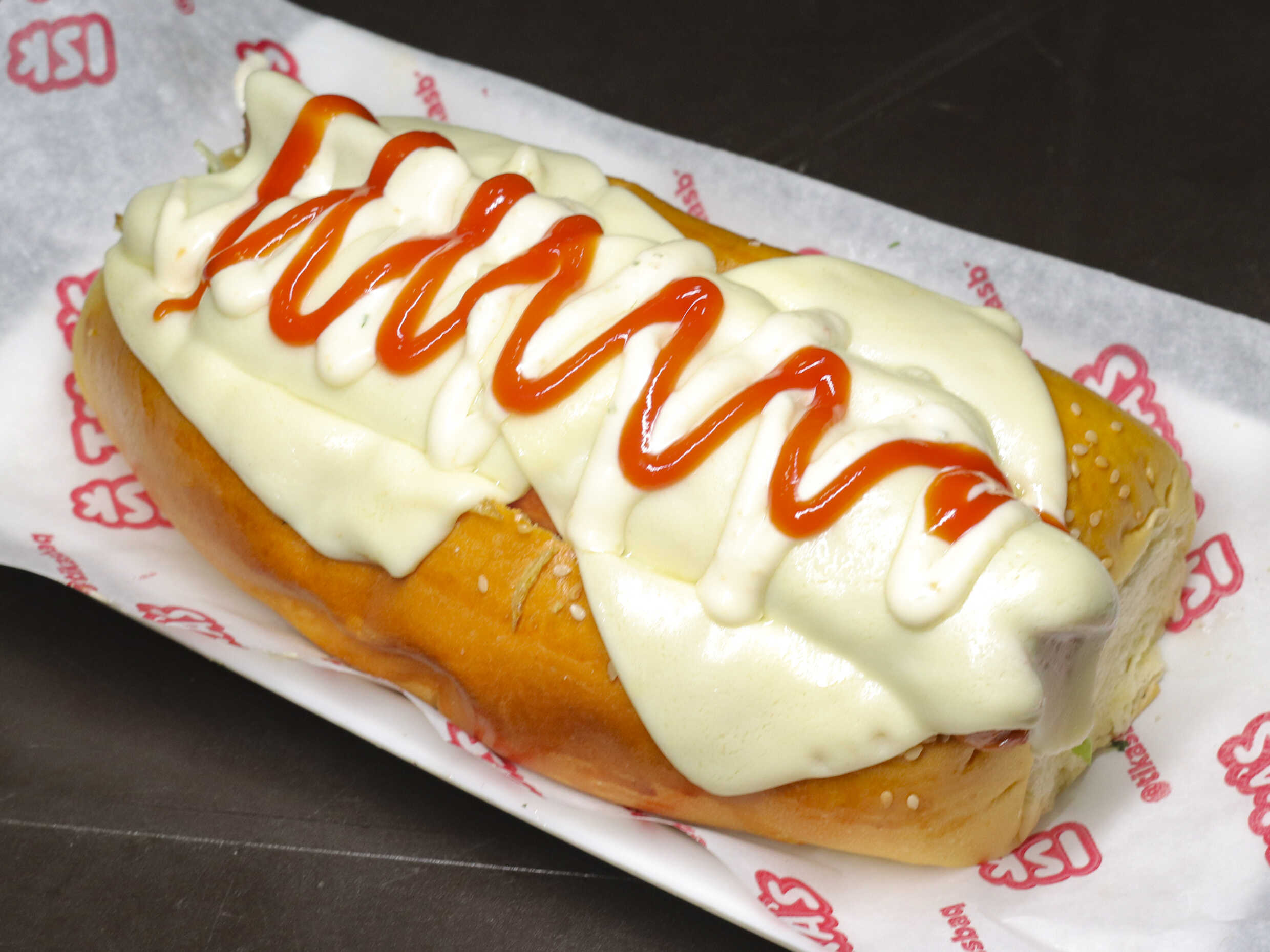 Salchicha ranchera super, queso mozarella, lechuga batabia, papa chongo, salsa tartara y salsa de tomate