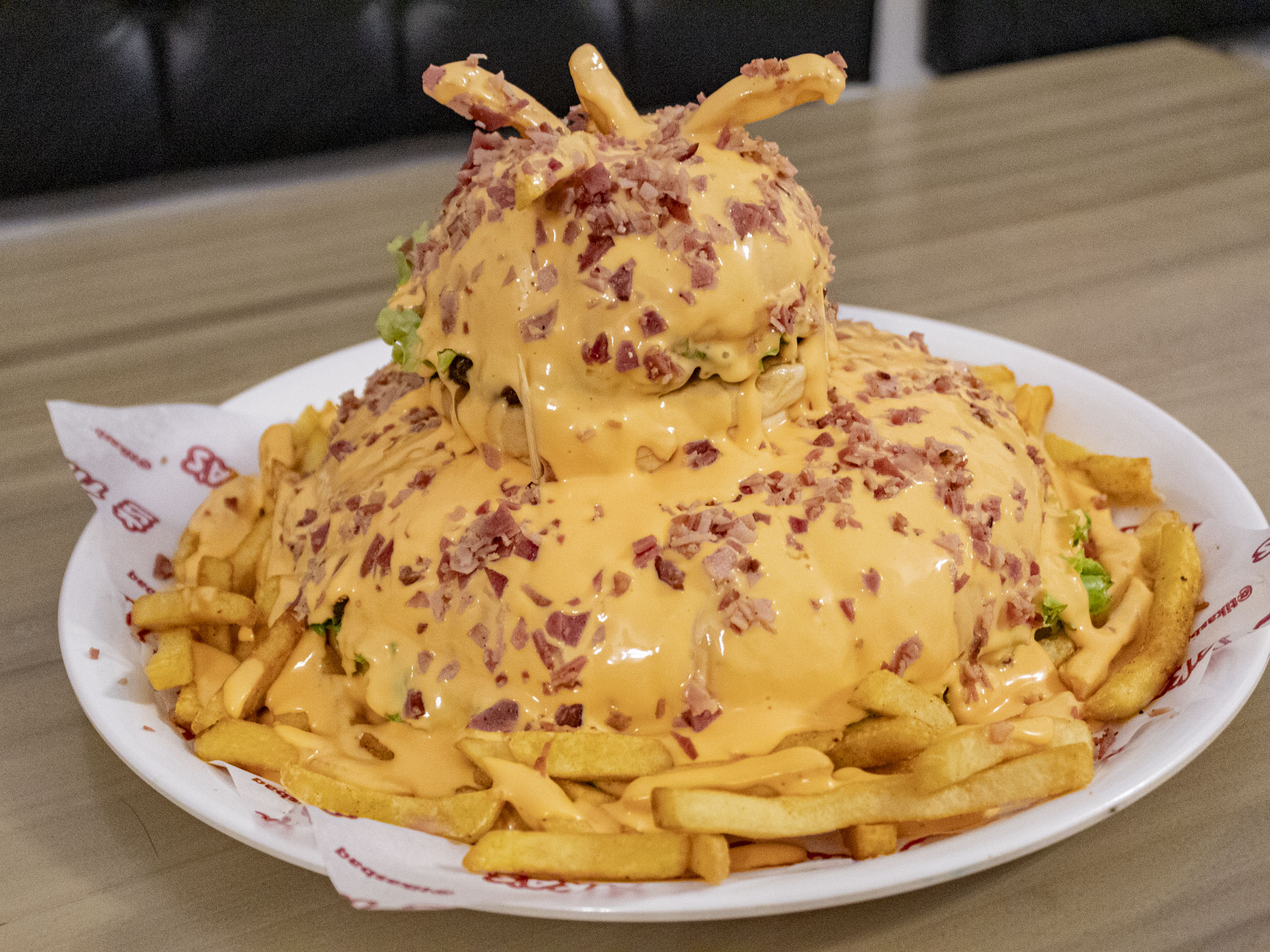 Base de papas a la francesa, Carne de res 100 % nacional (400 g), queso mozzarella, cebolla grille, tocineta crunchy, lechuga crespa, tomate, TODO ESTO BAÑADO EN QUESO CHEDDAR DERRETIDO Y TOCINETA PICADITA