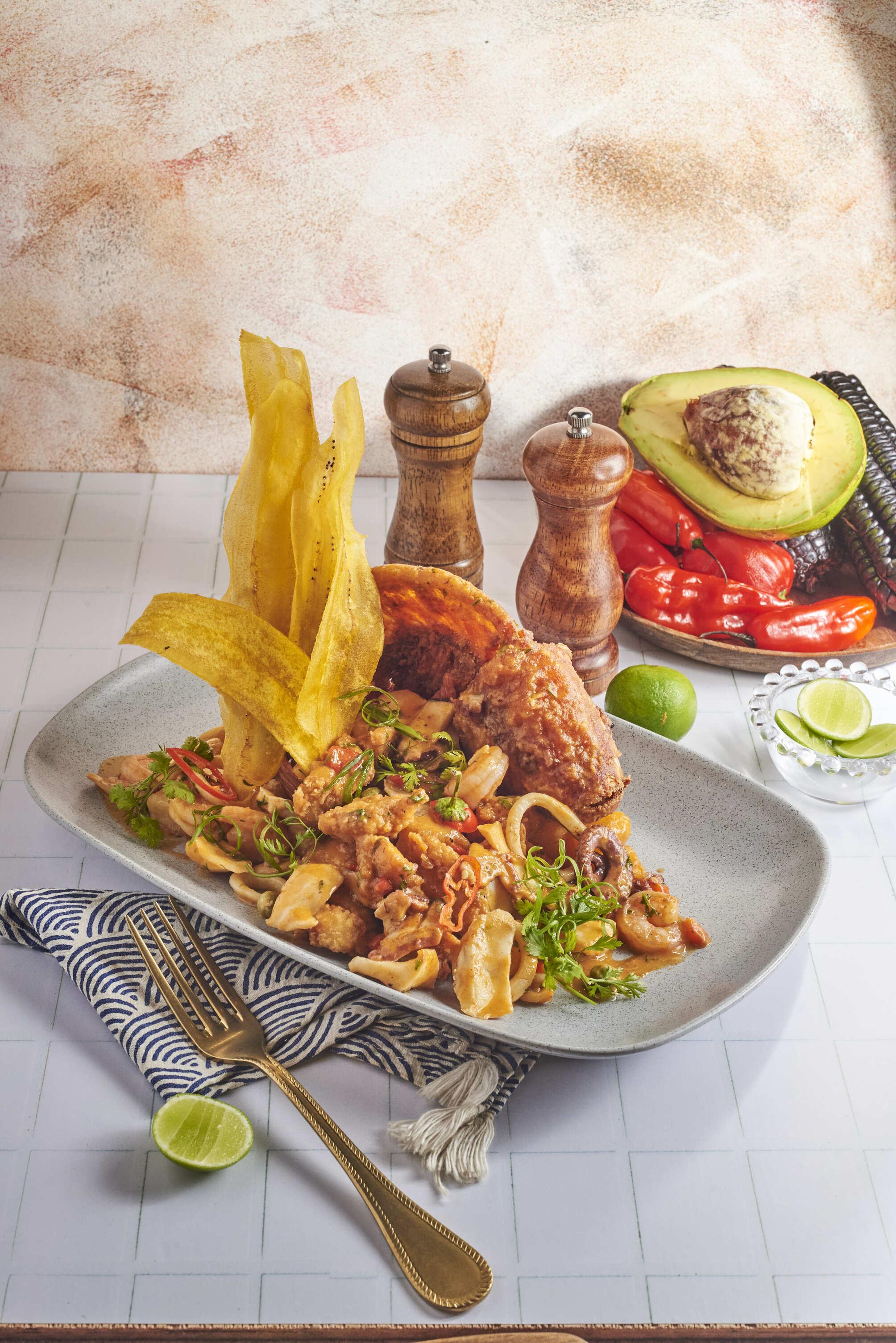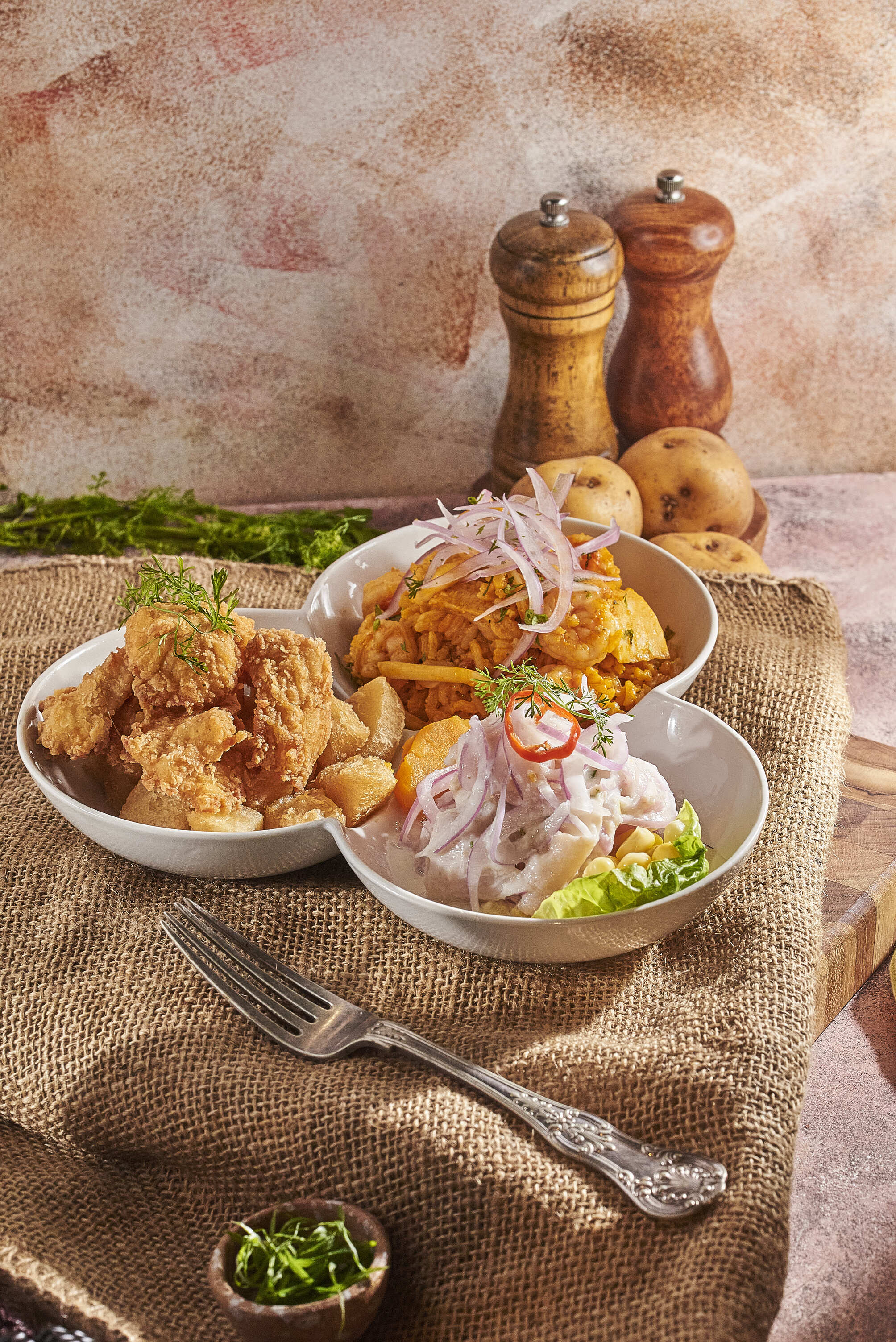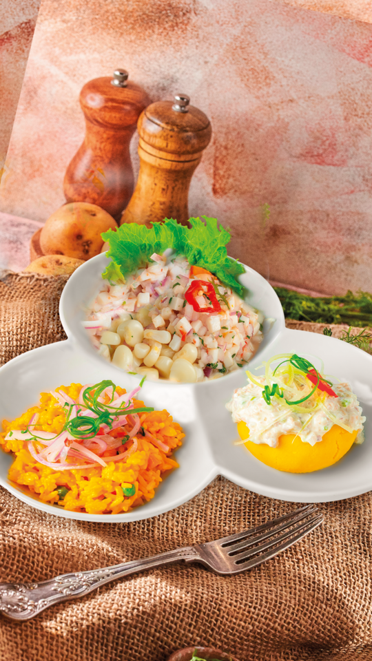 Causa limeña, 140 g chicharrón de pescado, 100 g ceviche clásico, 200 g arroz con mariscos, leche de tigre o coctel de camarones.