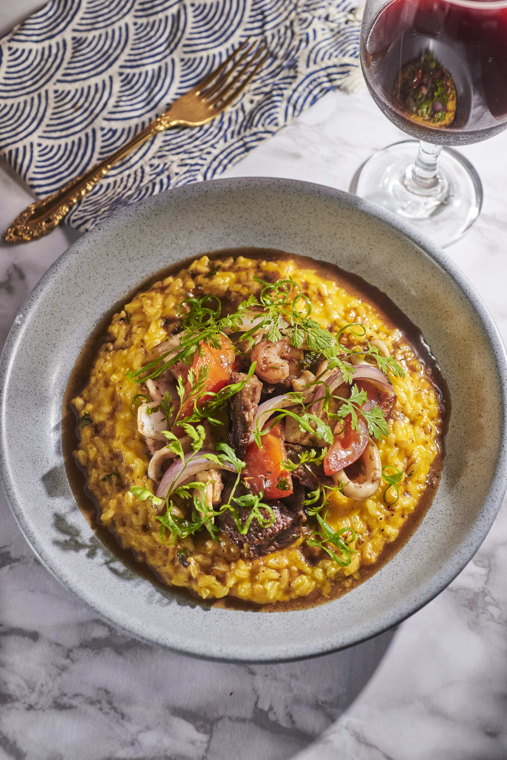 Nuestro risotto con el sabor a salsa huancaína con mariscos y lomo fino salteado.
