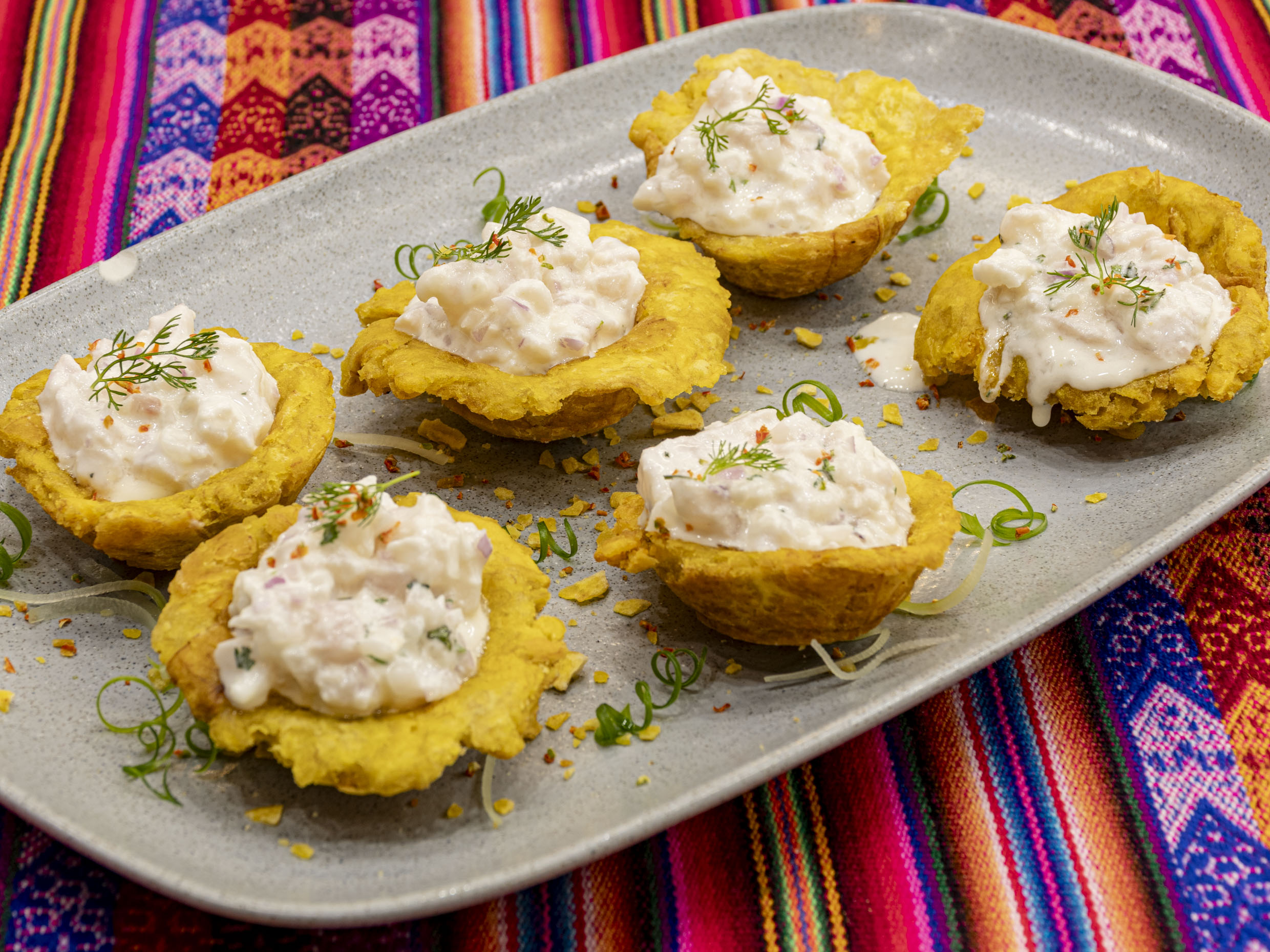 6 Patacones coronados con 75 g de ceviche cremoso.