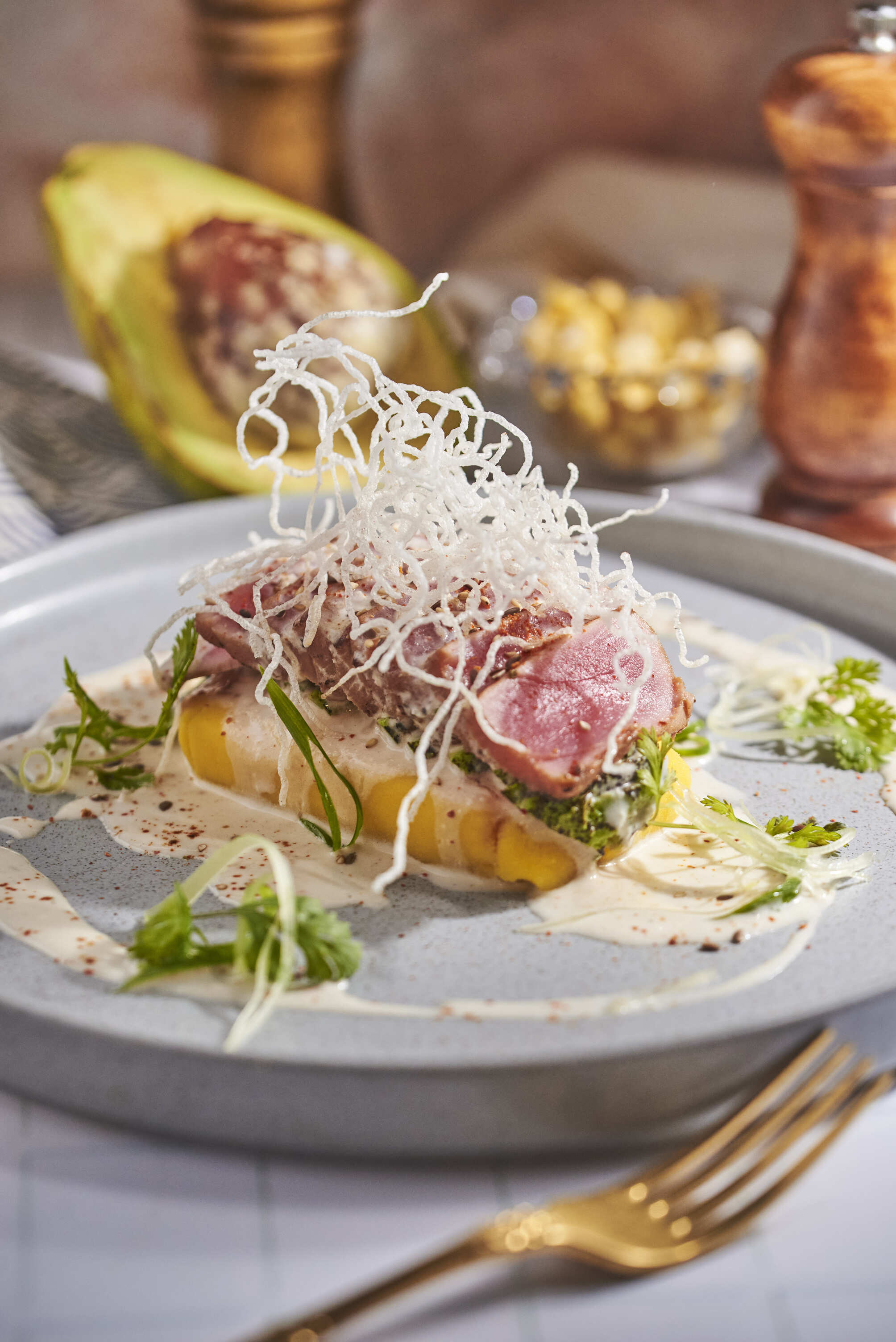 Masa de causa coronada con 75 g atún flambeado al estilo japonés.