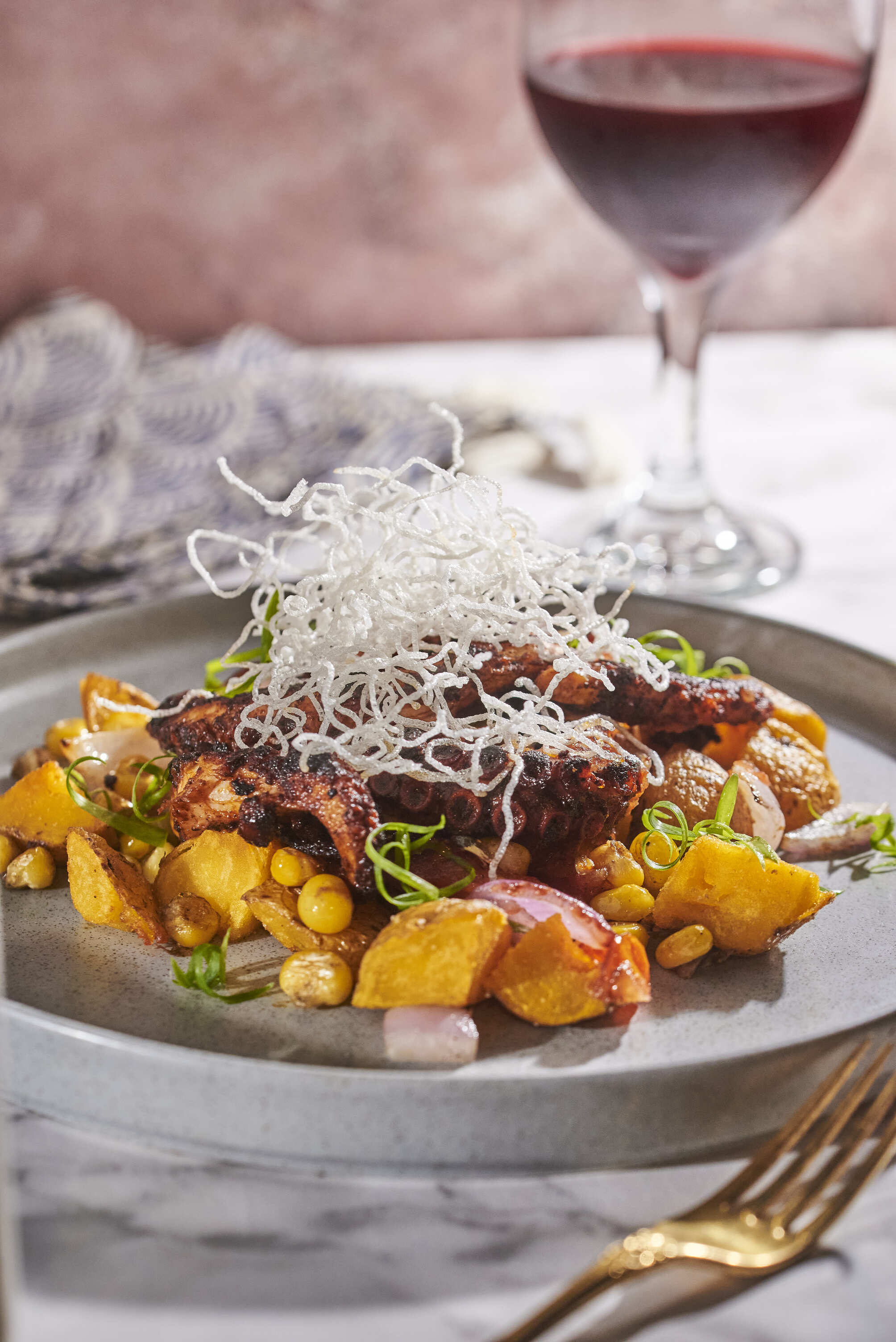 170 g De pulpo a la parrilla con aderezo anticuchero, papa crocantes y choclo.