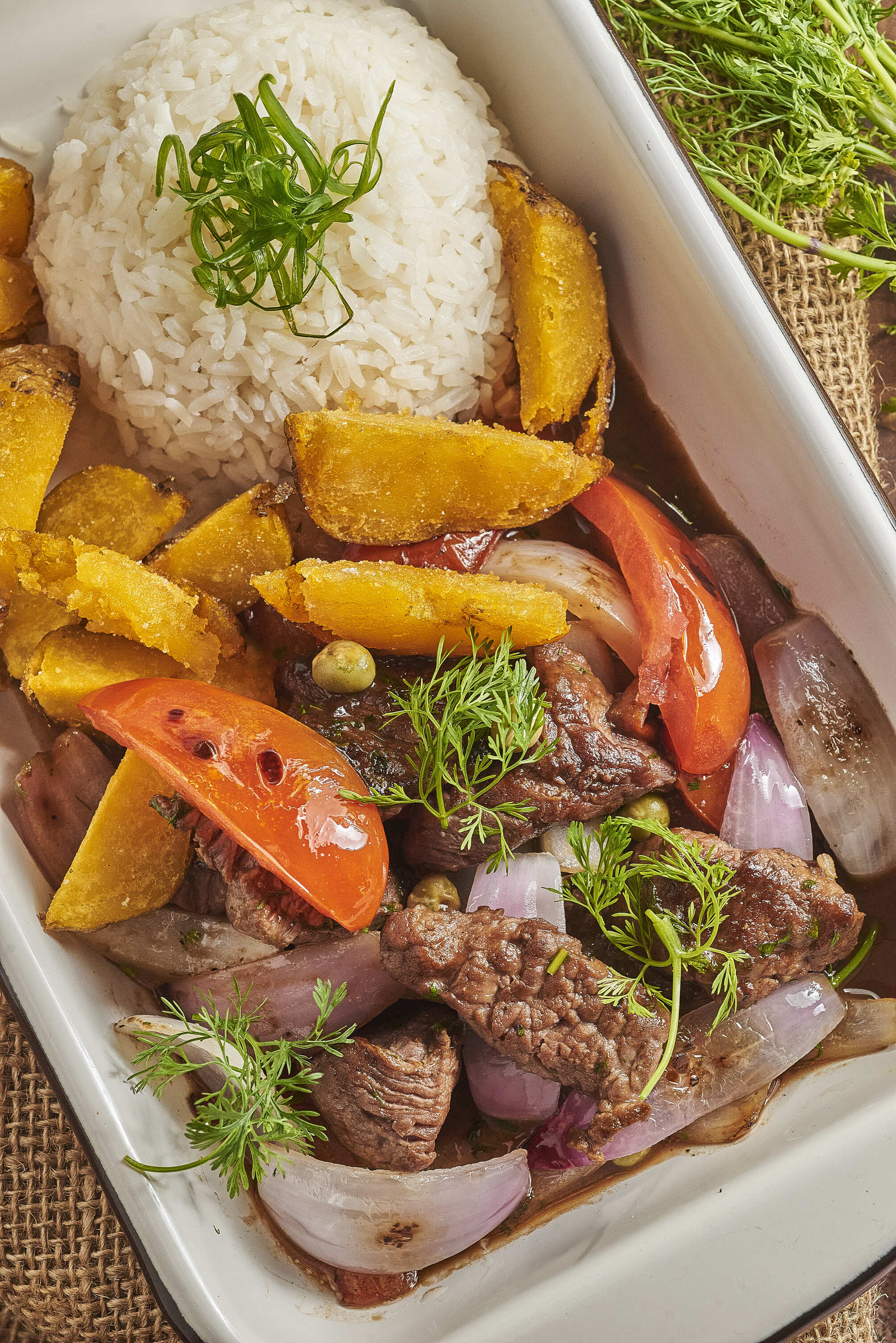 180 g De lomo fino de res salteado al wok con papas fritas crocantes y arroz.