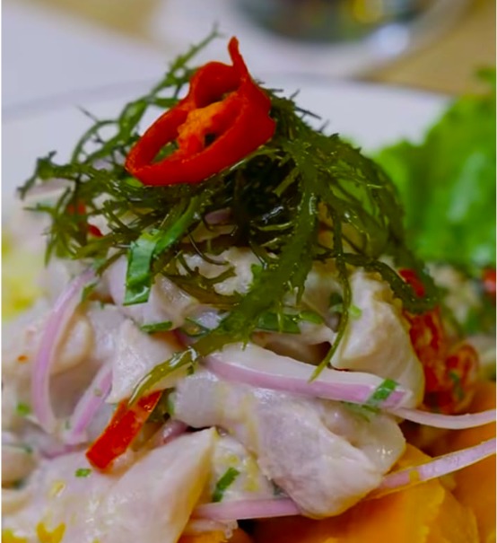 80 g De ceviche de pescado y 80 g de mariscos jugosos con batata dulce y choclo.