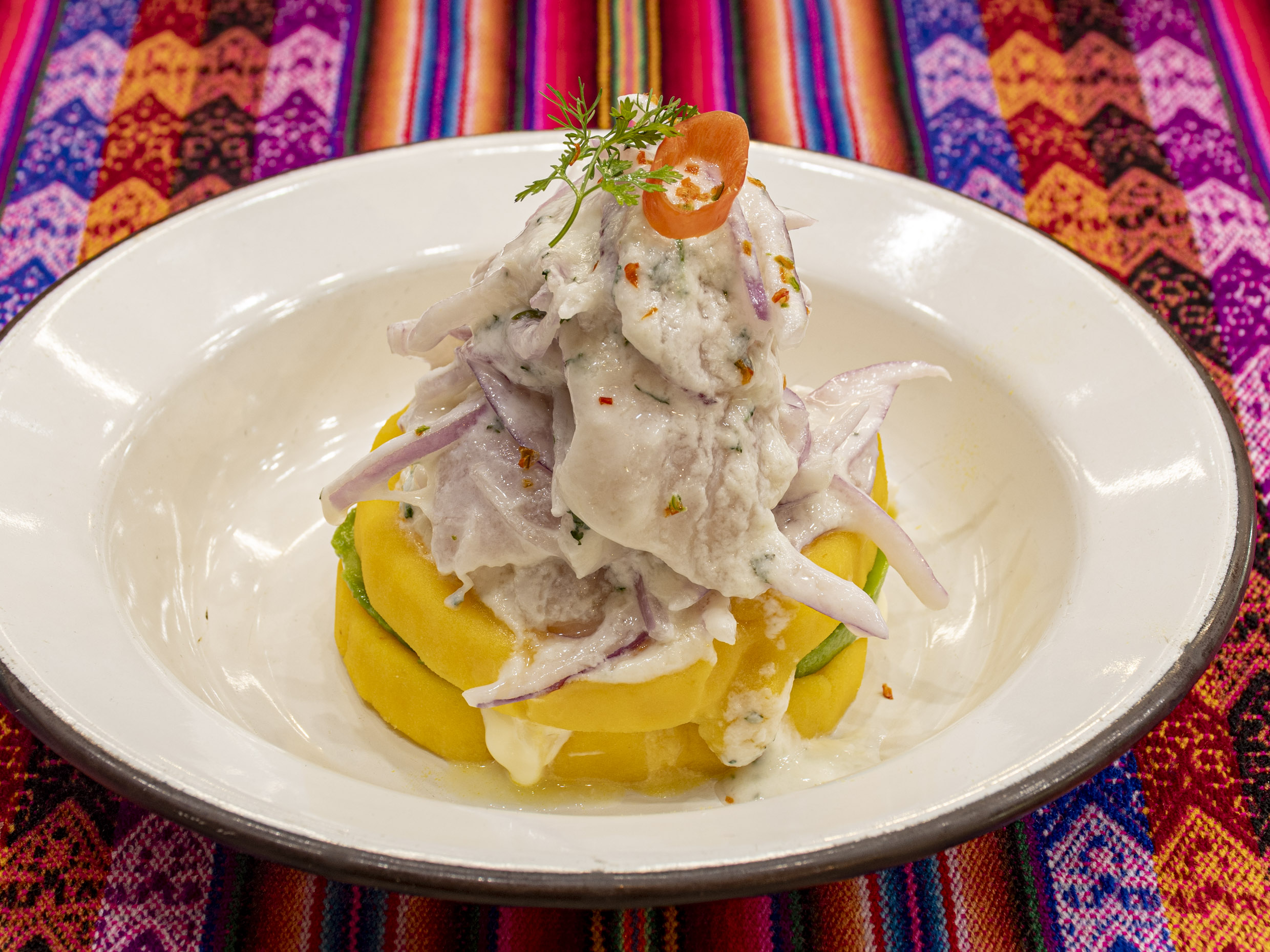 Papa sazonada con ajíes y aromas peruanos coronado con ceviche clásico 100 g.