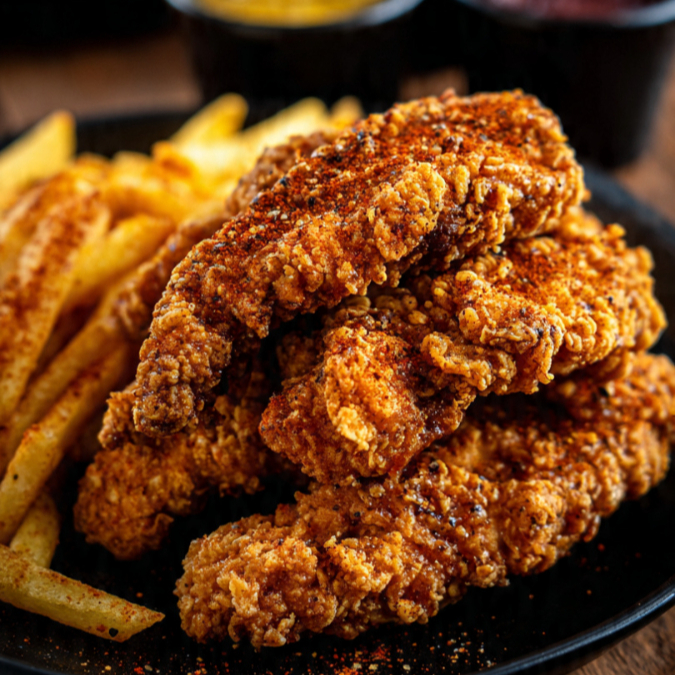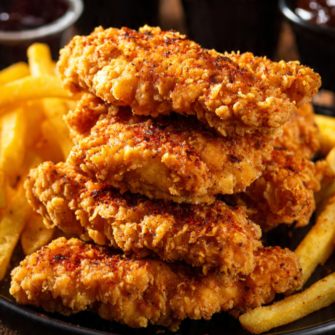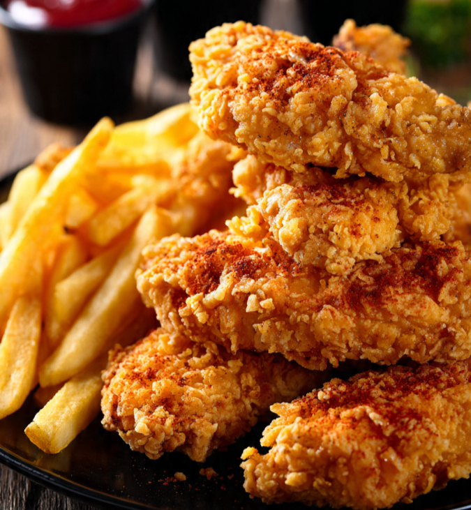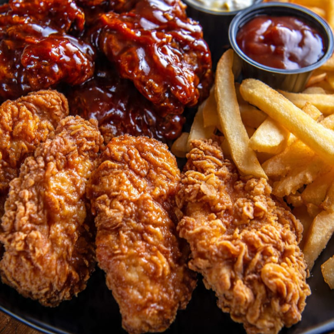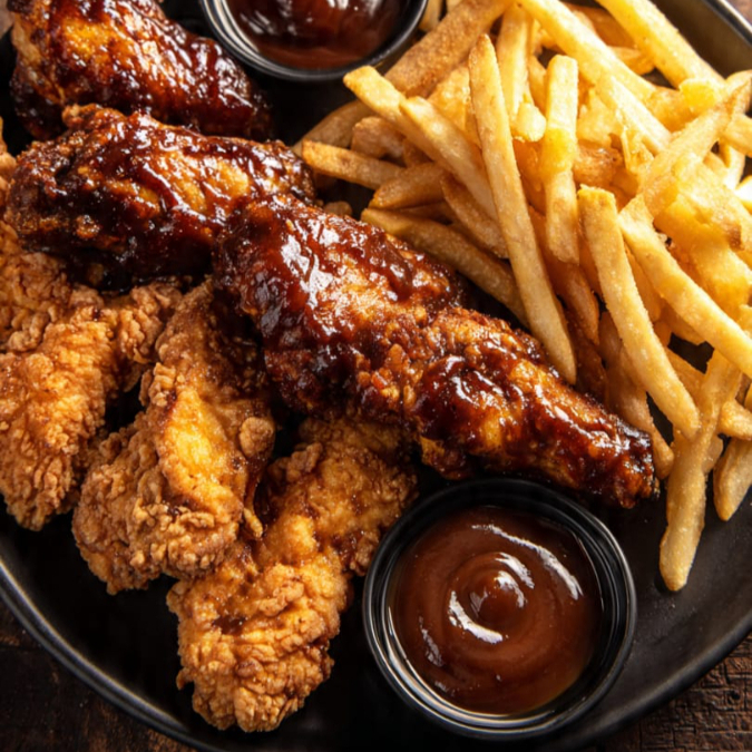 4 tenders 200gr de pechuga, 150gr de papas a la francesa o cascos de papa, 1 salsa de preferencia