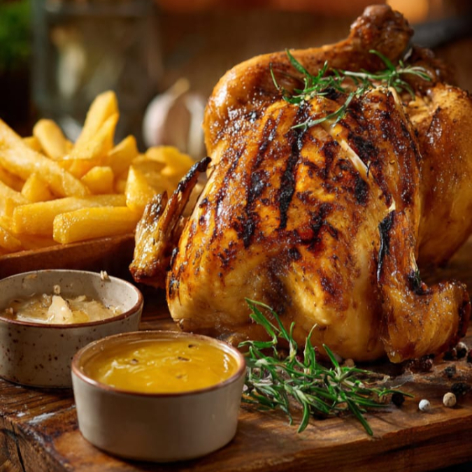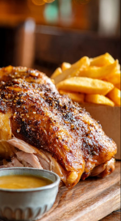 Pollo asado, papas a la francesa 1 maduro.con queso y bocadillo. 2 salsa