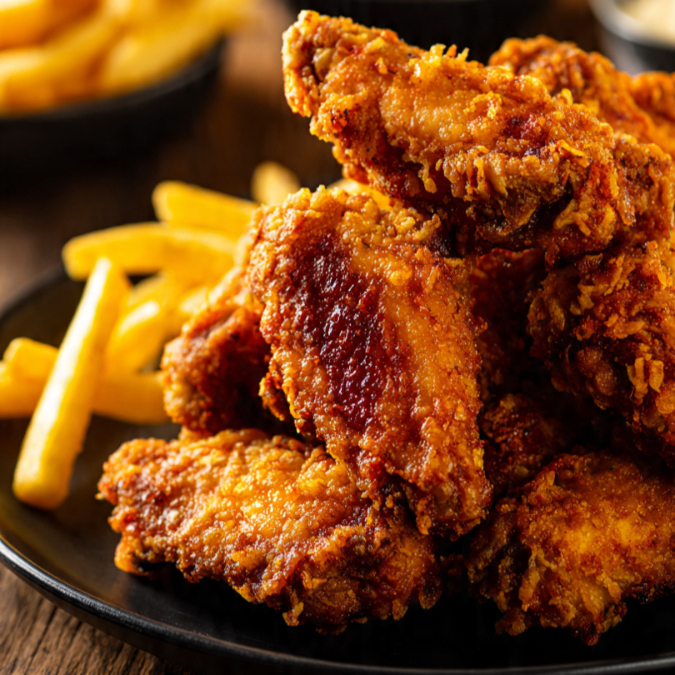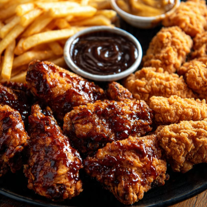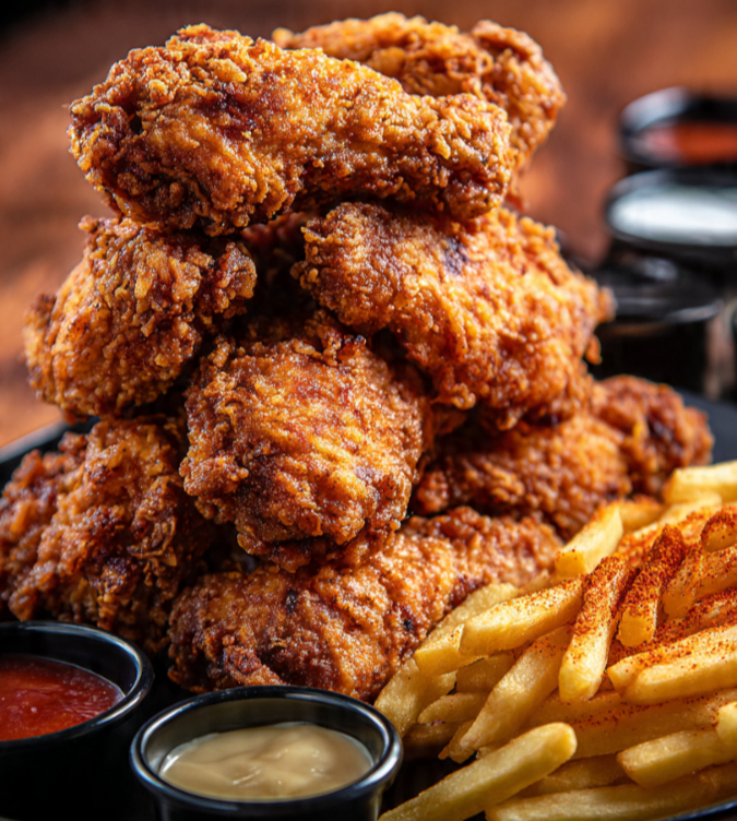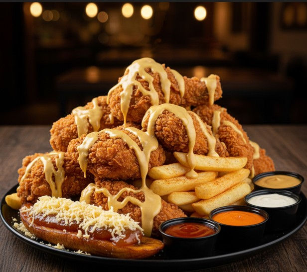 4 Presas de pollo broasted con nuestro apanado original, tenders de pechuga 200gr, 6 alitas, 1 madurito con queso y bocadillo, 2 papas a la francesa, gaseosa postobon 1.5l y 3 salsas a eleccion.