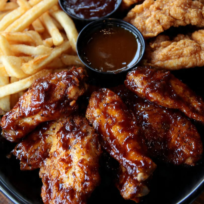 8 de las mejores alitas con nuestro apanado original, acompanadas o banadas en nuestras salsas, 8 tenders 400gr de pechuga 2 salsa a su eleccion, acompañadas de 2 papas a la francesa. o cascos de papa y 1 gaseosa