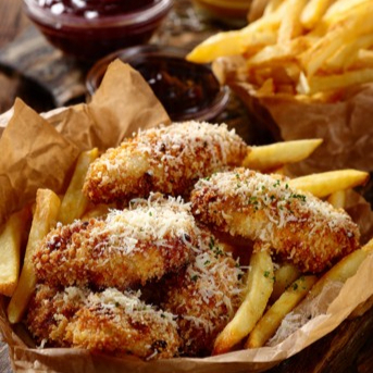 12 tenders 600gr de pechuga, 3 papas a la francesa de 150gr c/u o cascos de papa, 3 salsa de preferencia