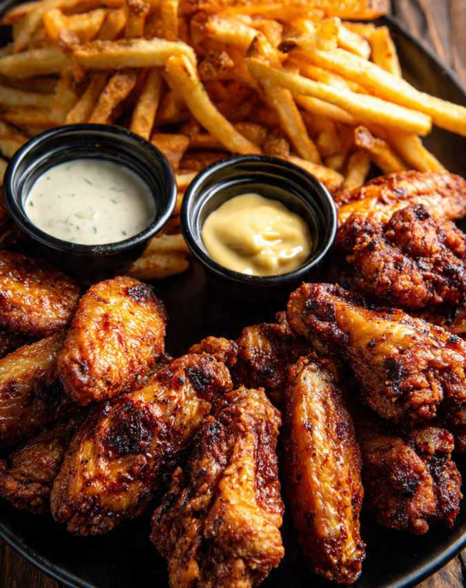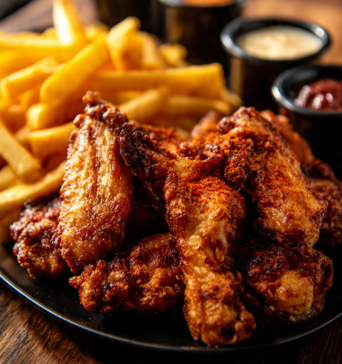 Las mejores alitas con nuestro apanado original, acompanadas o banadas en nuestras salsas, 2 salsa a su eleccion, acompañadas de papas a la francesa o cascos de papa.