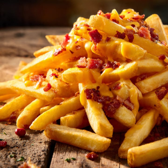250 gr de papa francesas bañadas con salsa de queso cheddar y trozos de tocineta.