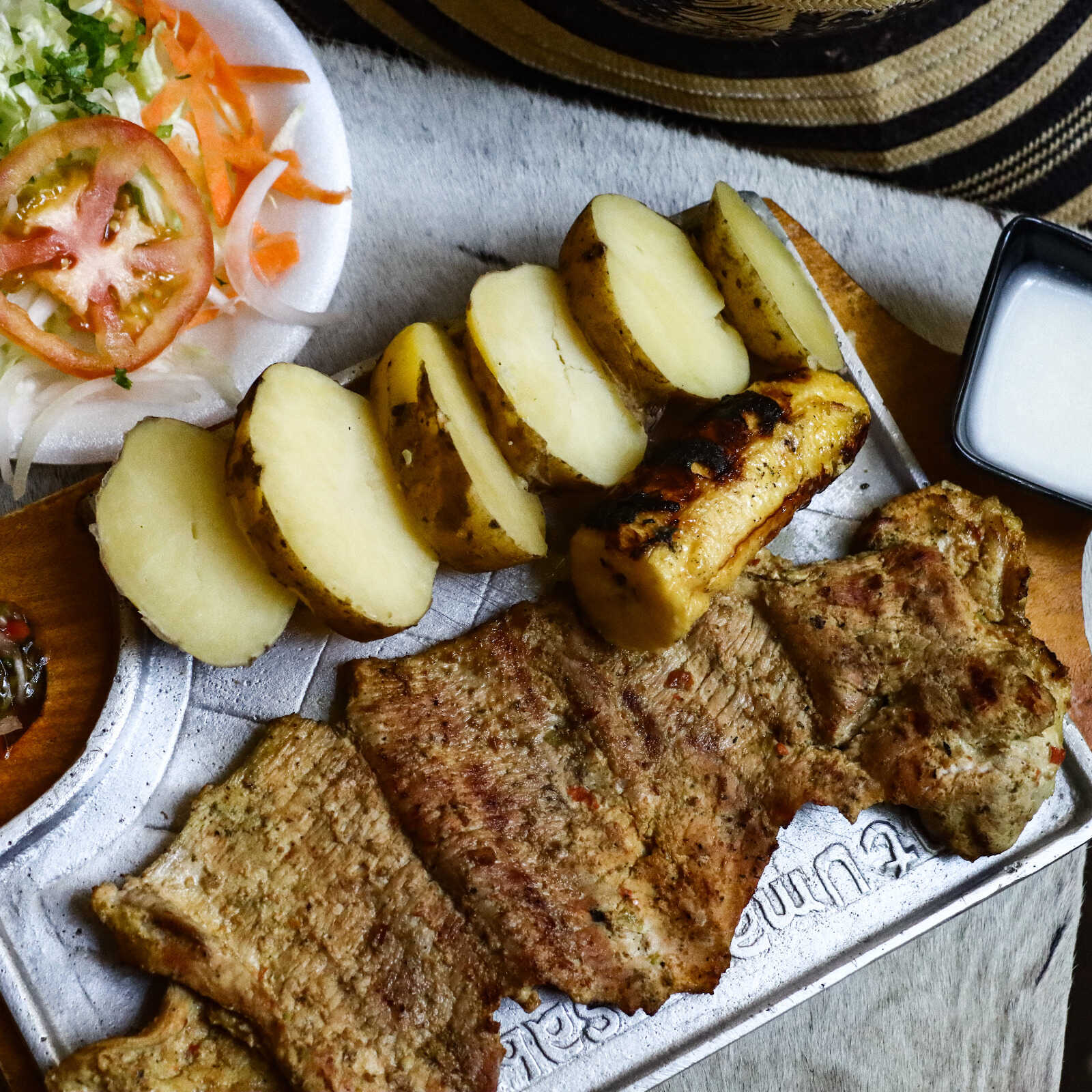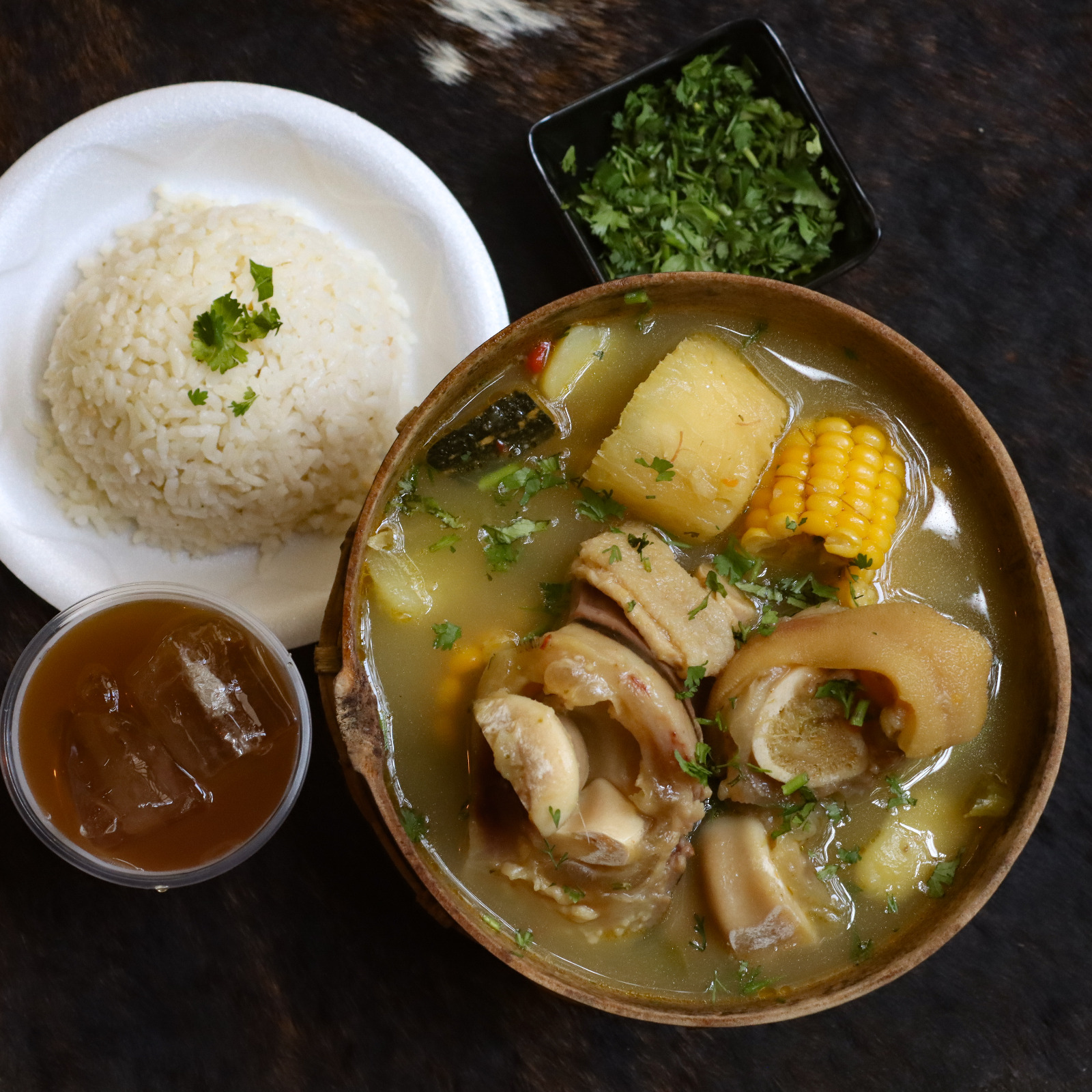 Sancocho de mondongo + asada de chuleta + jarra de panela.