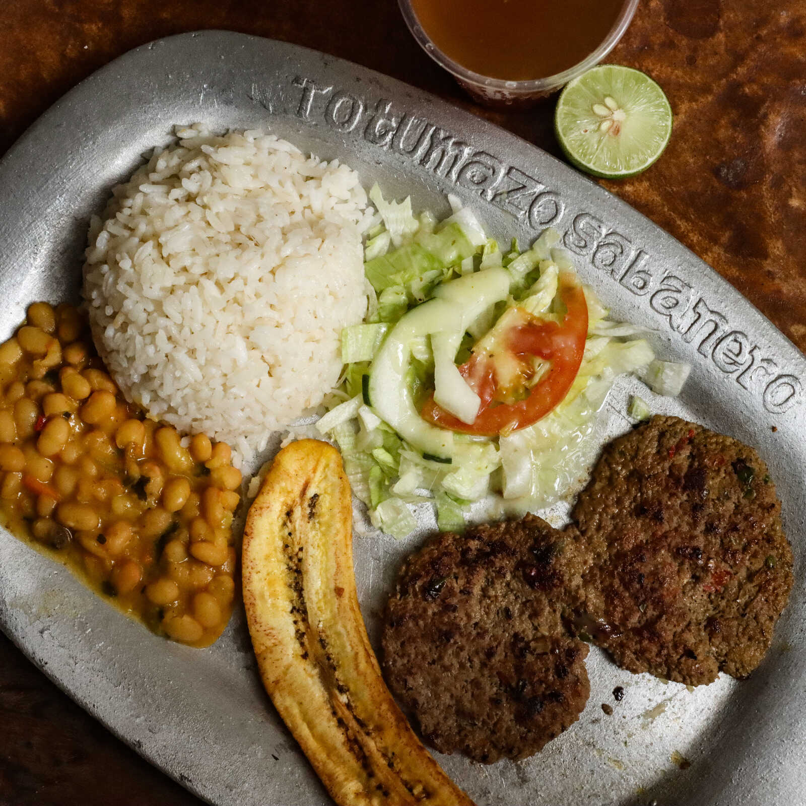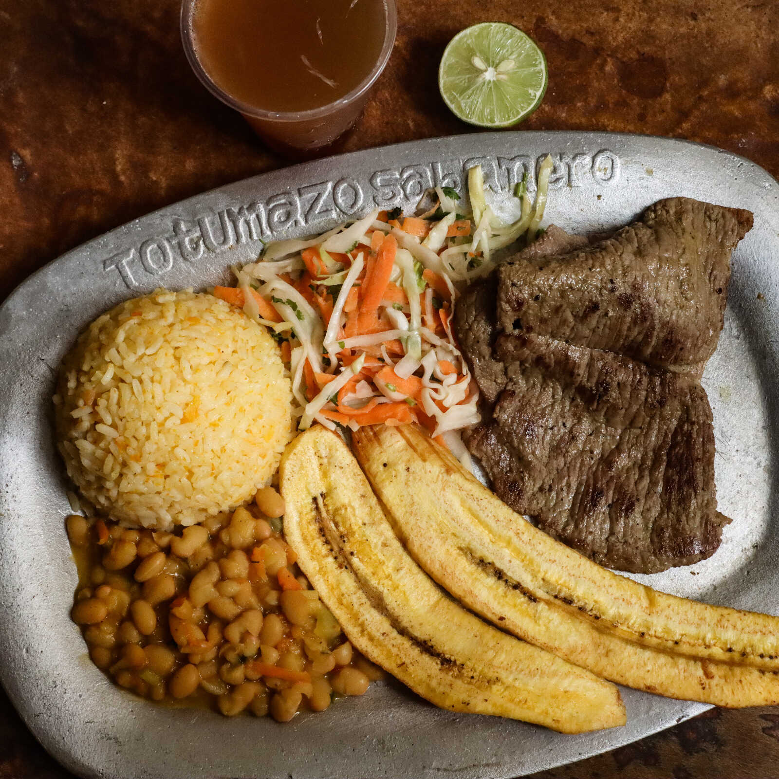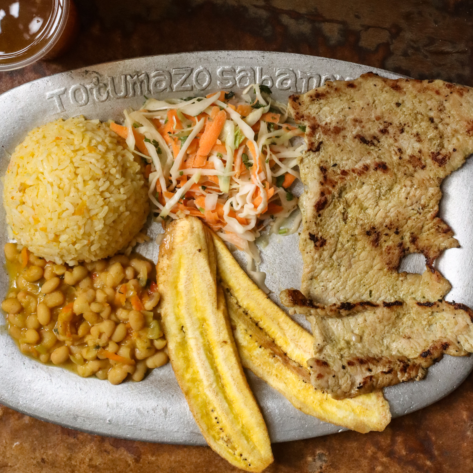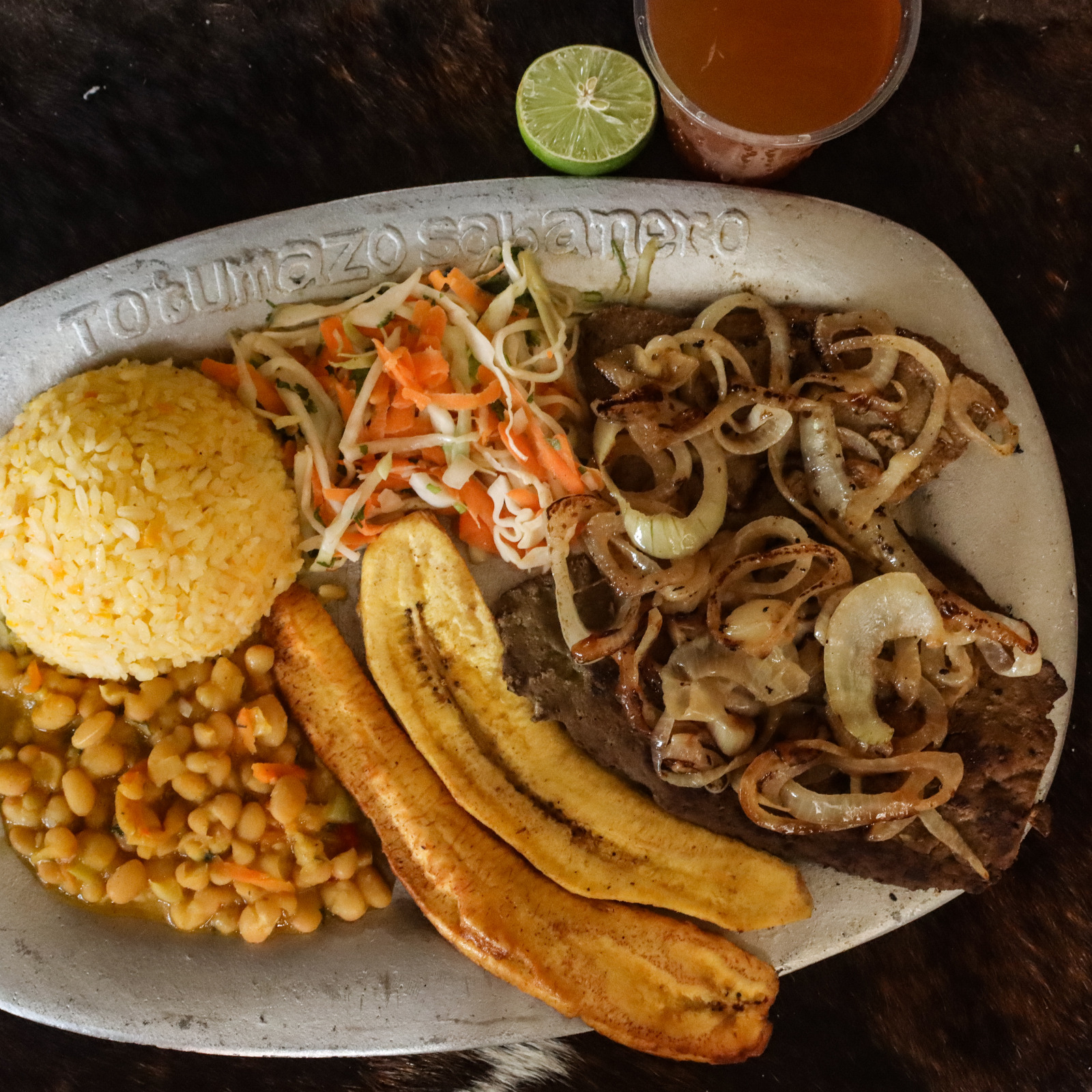 Acompañado de ensalada del día, arroz, granos y tajadas maduras.