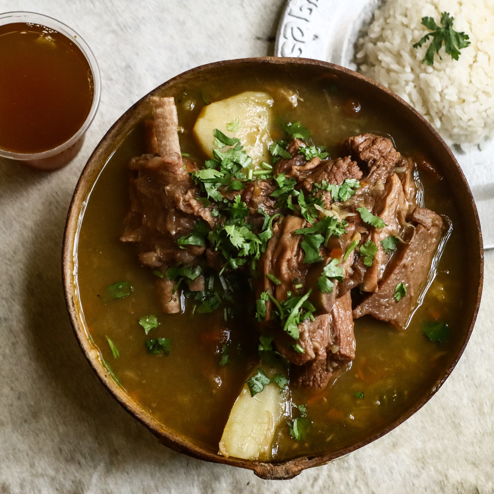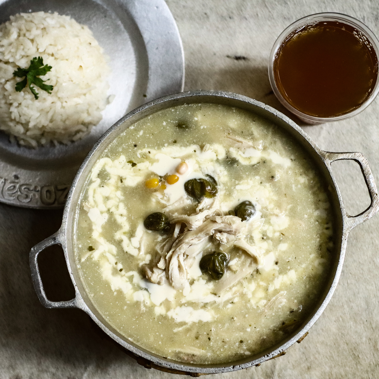 Sancocho de costilla acompañado con arroz blanco, mas bebida en boli.