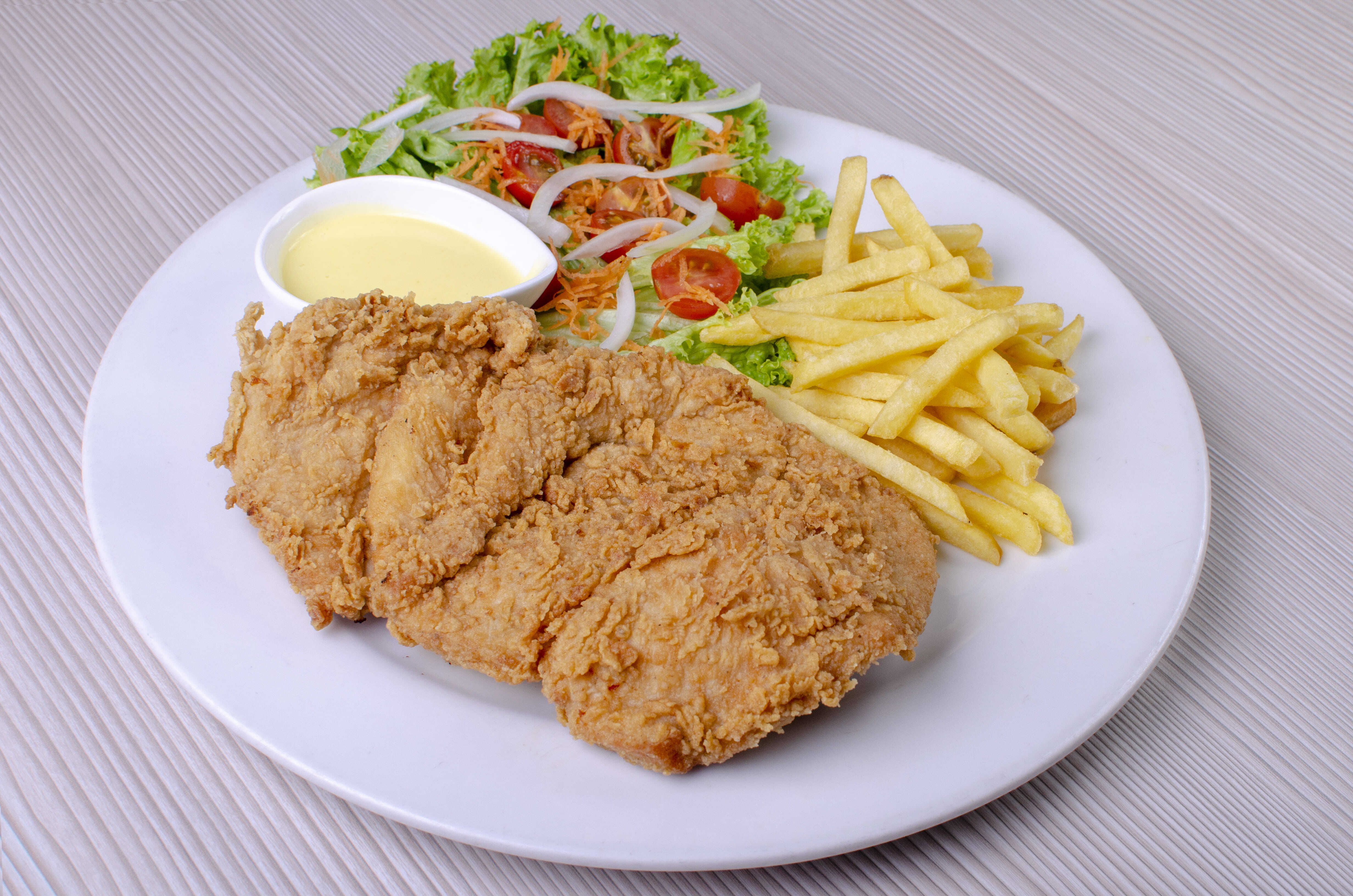 200gr De jugoso filete de pechuga apanado, ensalada, papas a la francesa y gaseosa 250 ml.