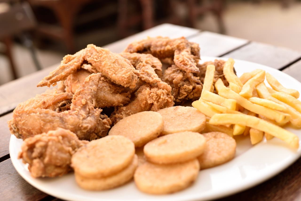 Pedacitos de pechuga apanados, papas a la francesa, jugo hit