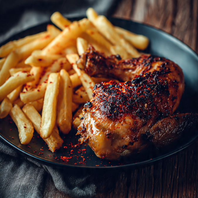 4 presas de pollo asado acompañado de papas a la francesas y gaseosa 250 ml.