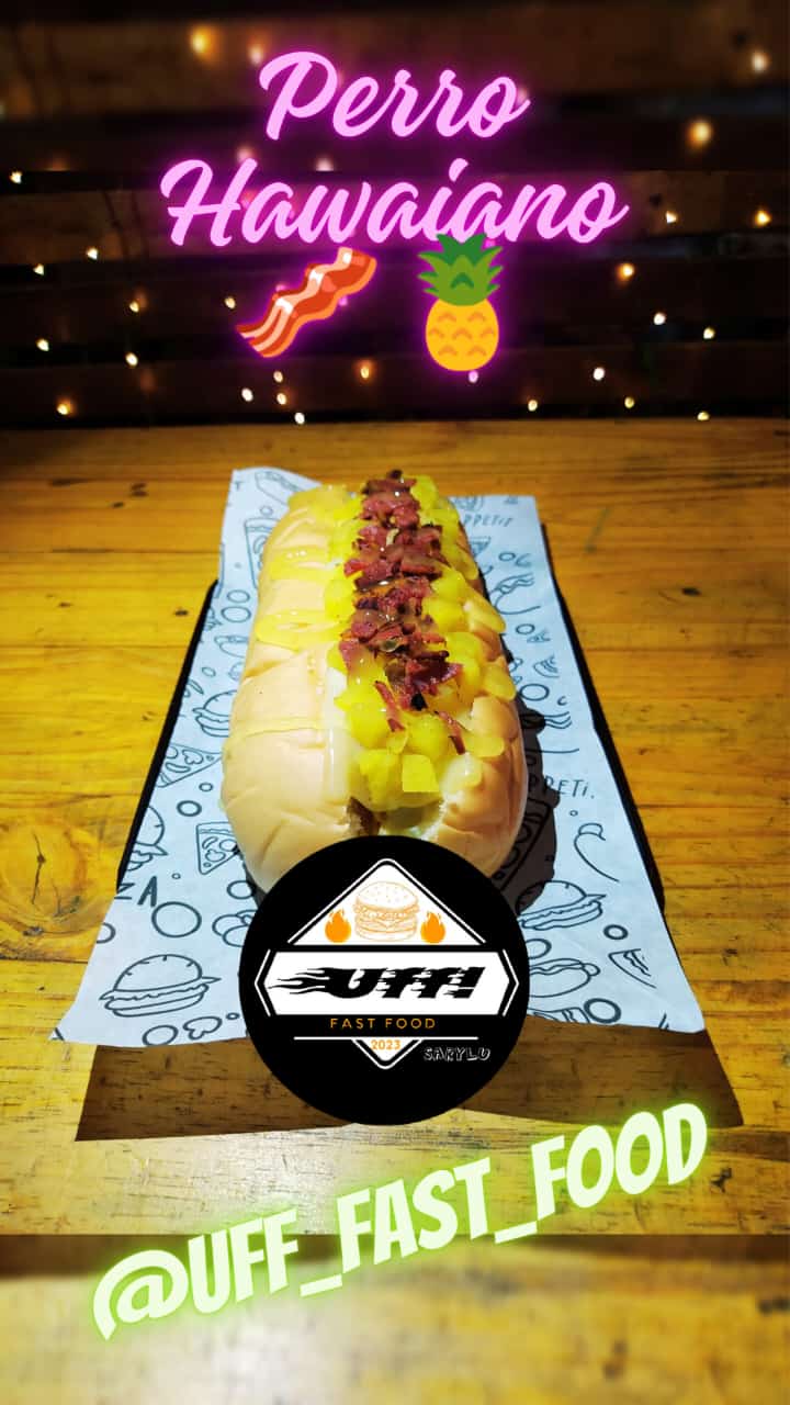 Pan de perro, salchicha de pollo, piña caramelizada, lechuga, queso costeño, papa chongo, queso mozzarella con maíz y salsa de la casa.