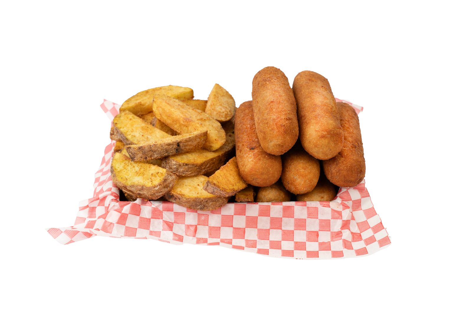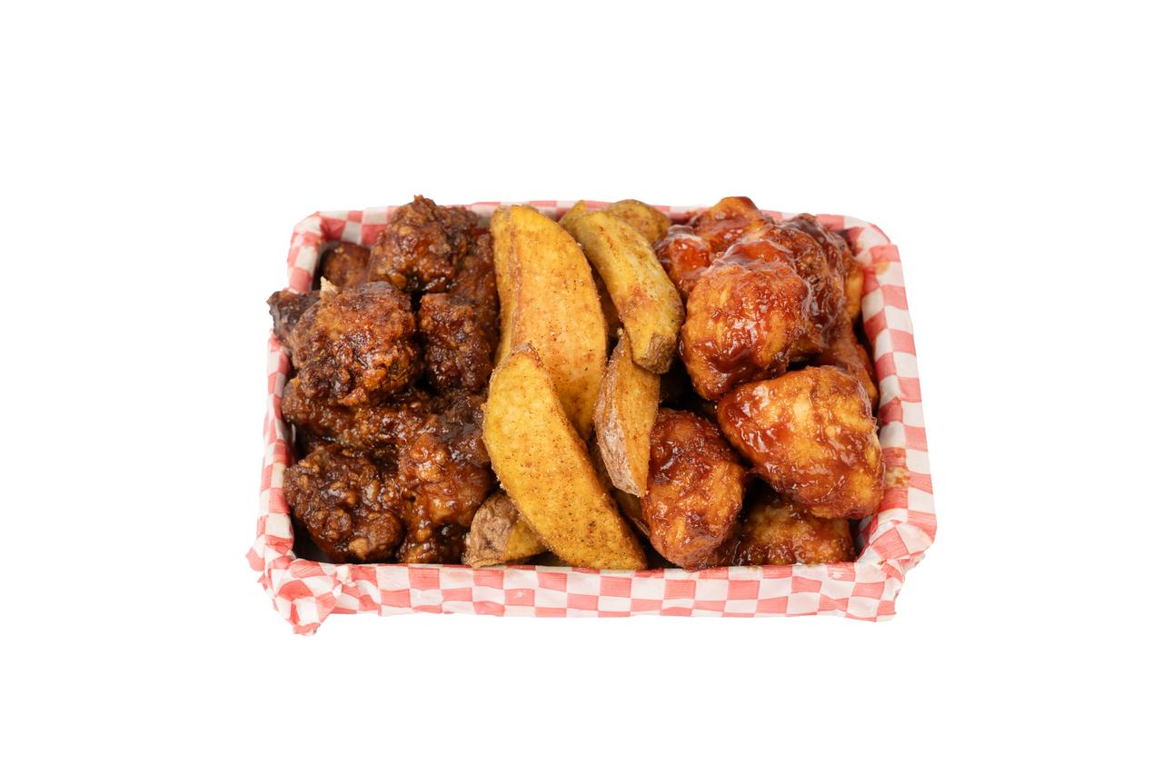 3 Alitas, 3 boneless, 3 dedos de queso, papas sazonadas.