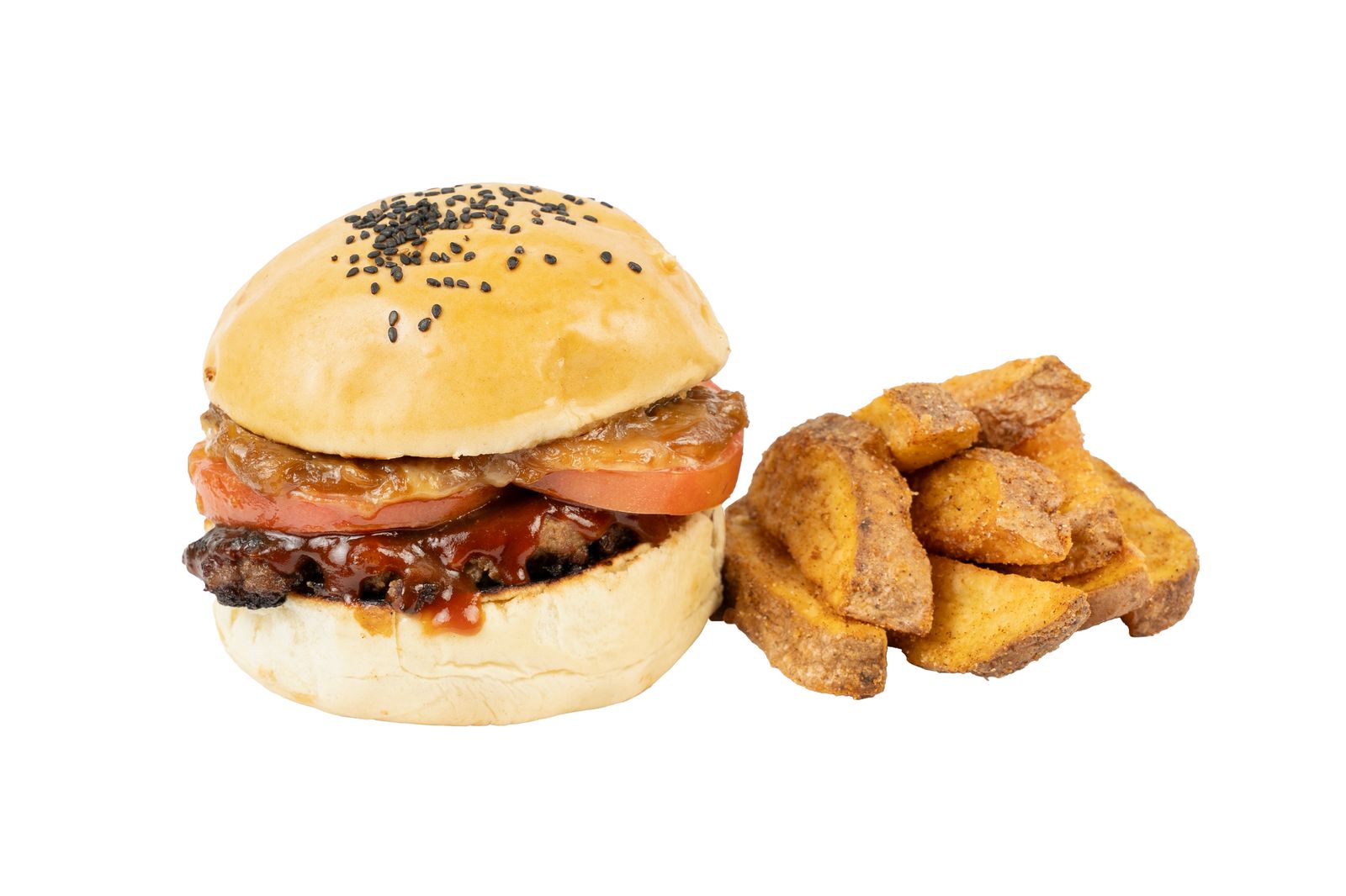 1 Res carne, 1 boneless, 2 rodajas de tomate, cebolla caramelizada, queso mozzarella, pan brioche, papas sazonadas.