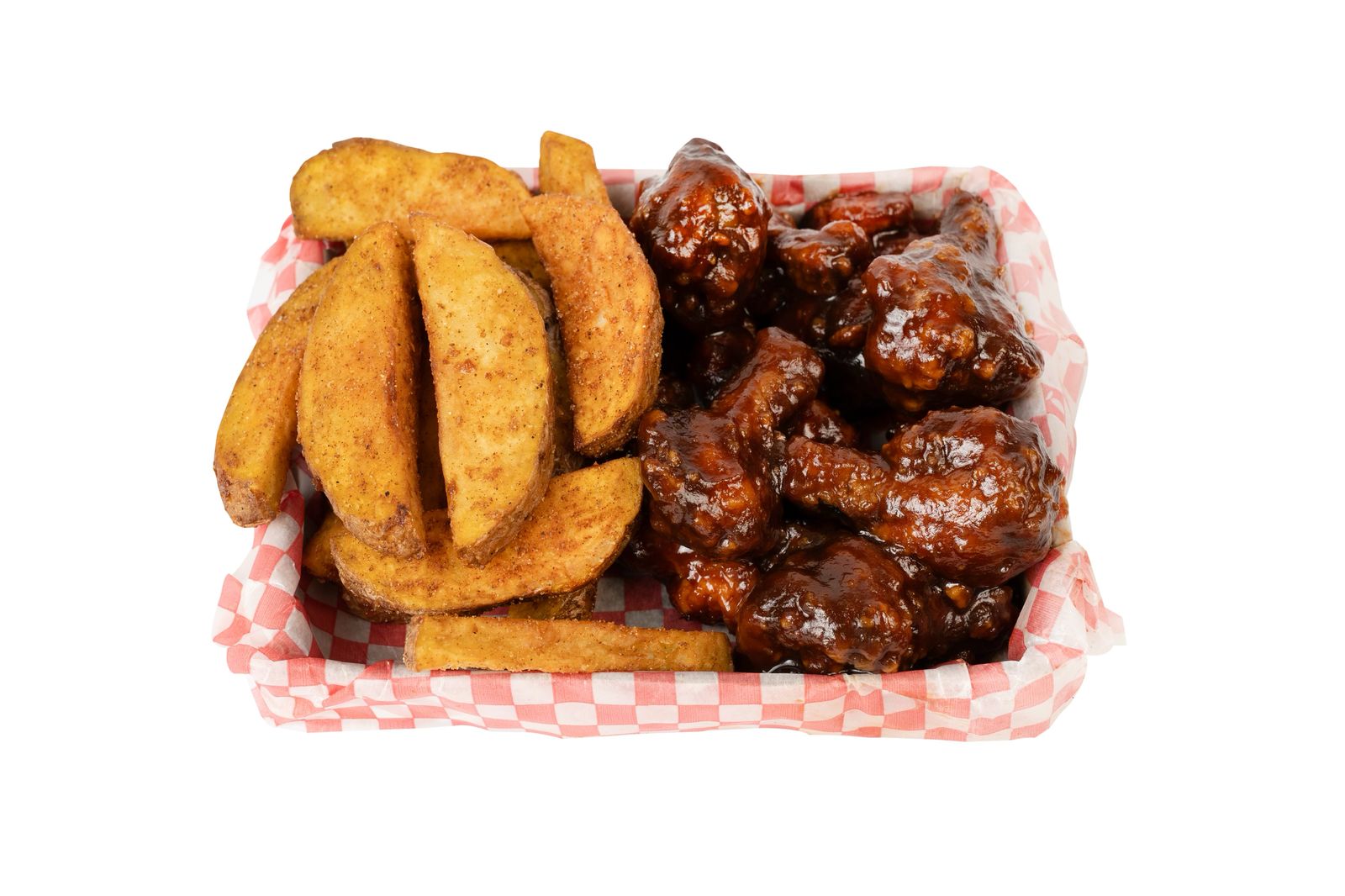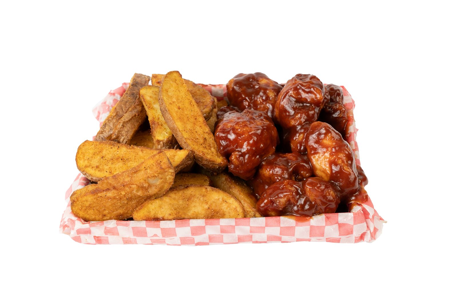 12 Alitas, 12 boneless, papas sazonadas.