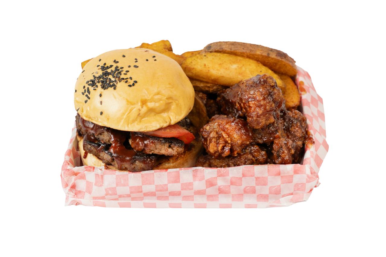 1 Burger res, 5 alitas, papas sazonadas.