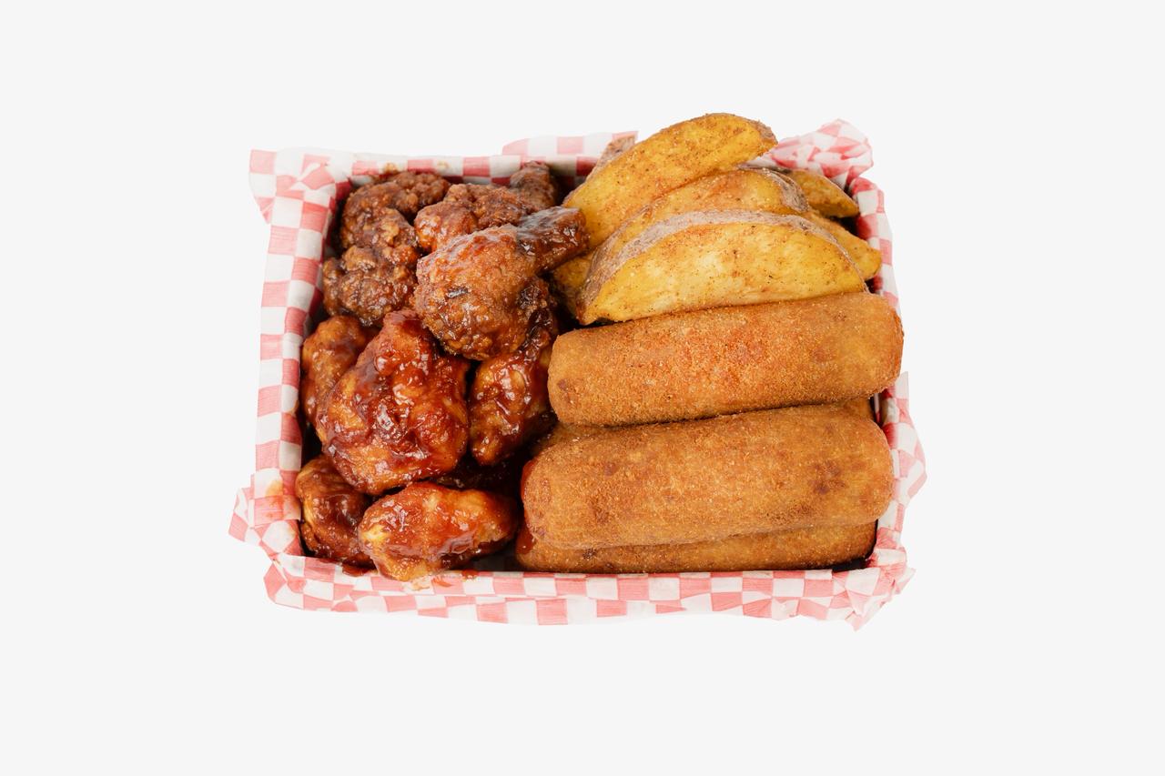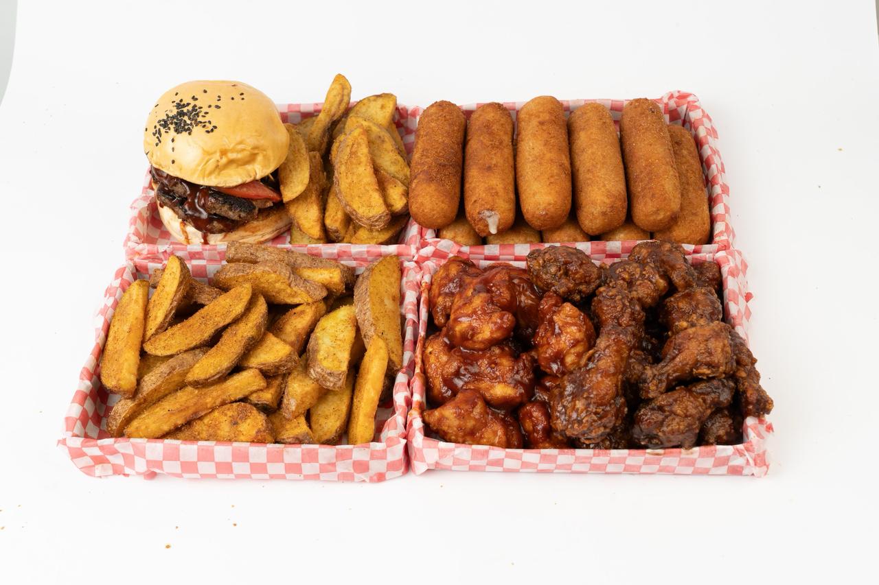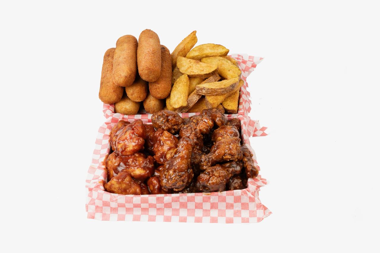 10 Alitas, 10 boneless, 10 dedos de queso, 1 res burger, papas sazonadas.