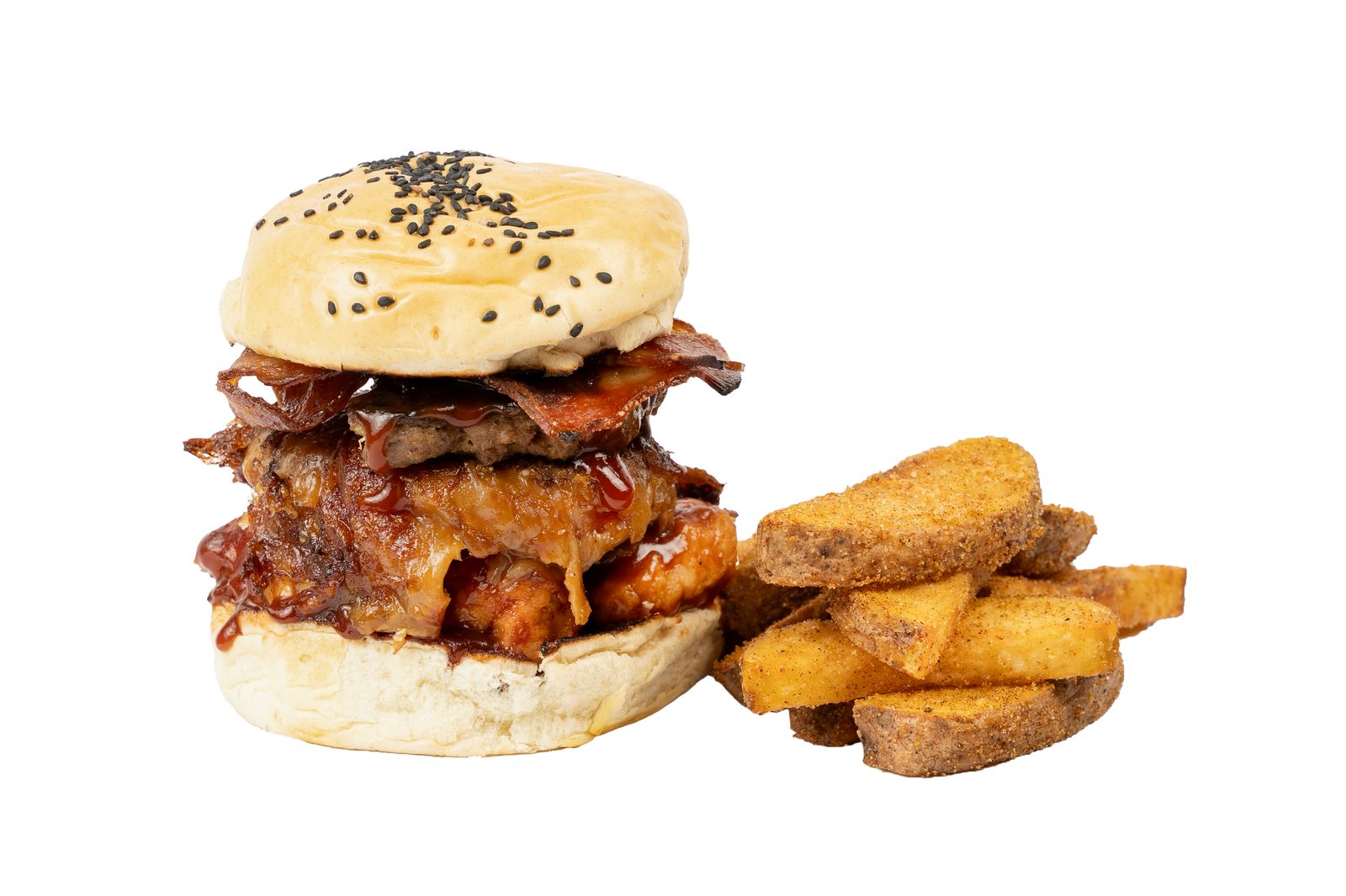 2 Carnes res, 2 rodajas de tomate, cebolla caramelizada, tocineta, queso mozzarella, pan brioche, papas sazonadas.