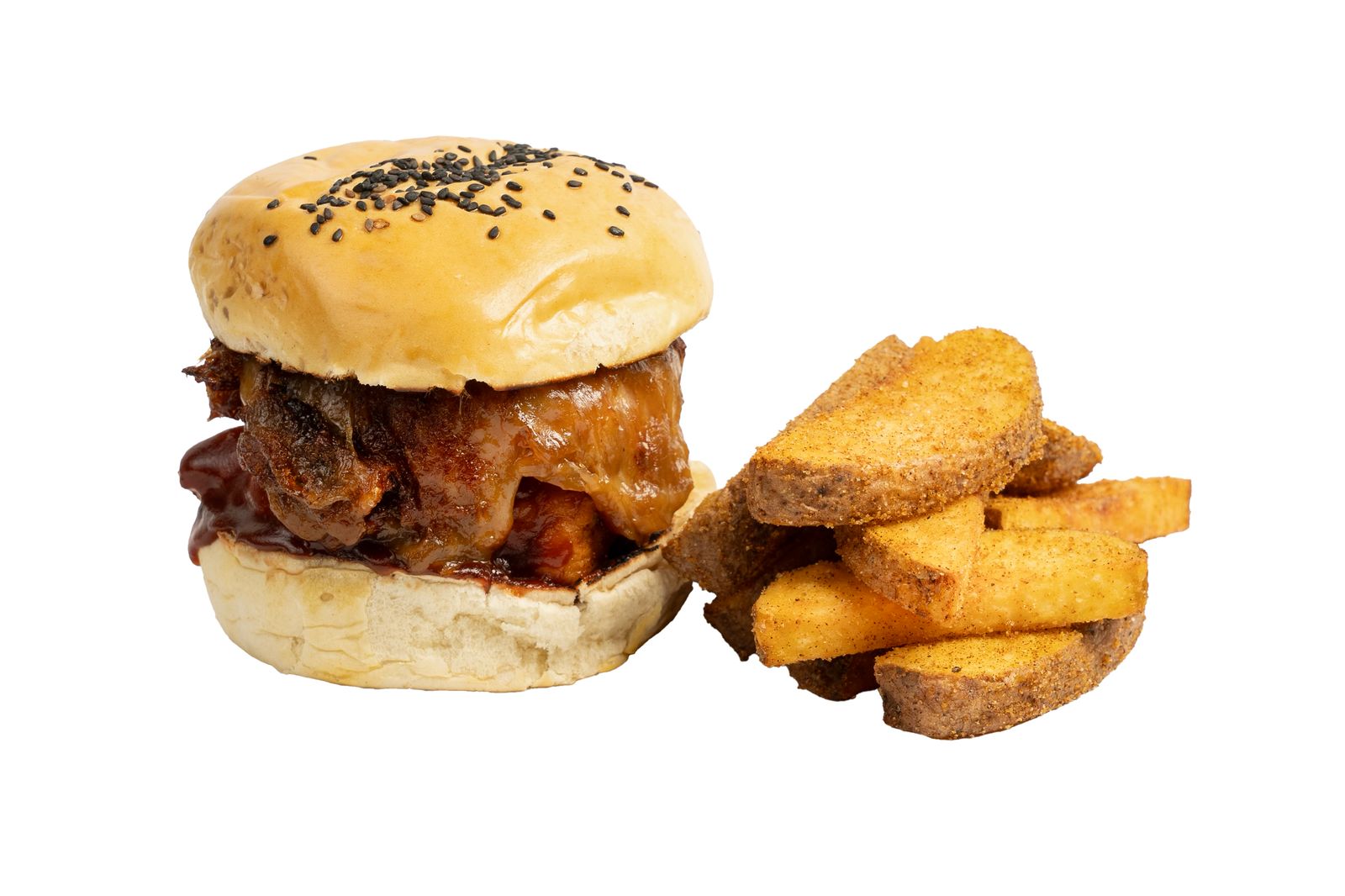 Boneless, 2 rodajas de tomate, cebolla caramelizada, queso mozzarella, pan brioche, papas sazonadas.