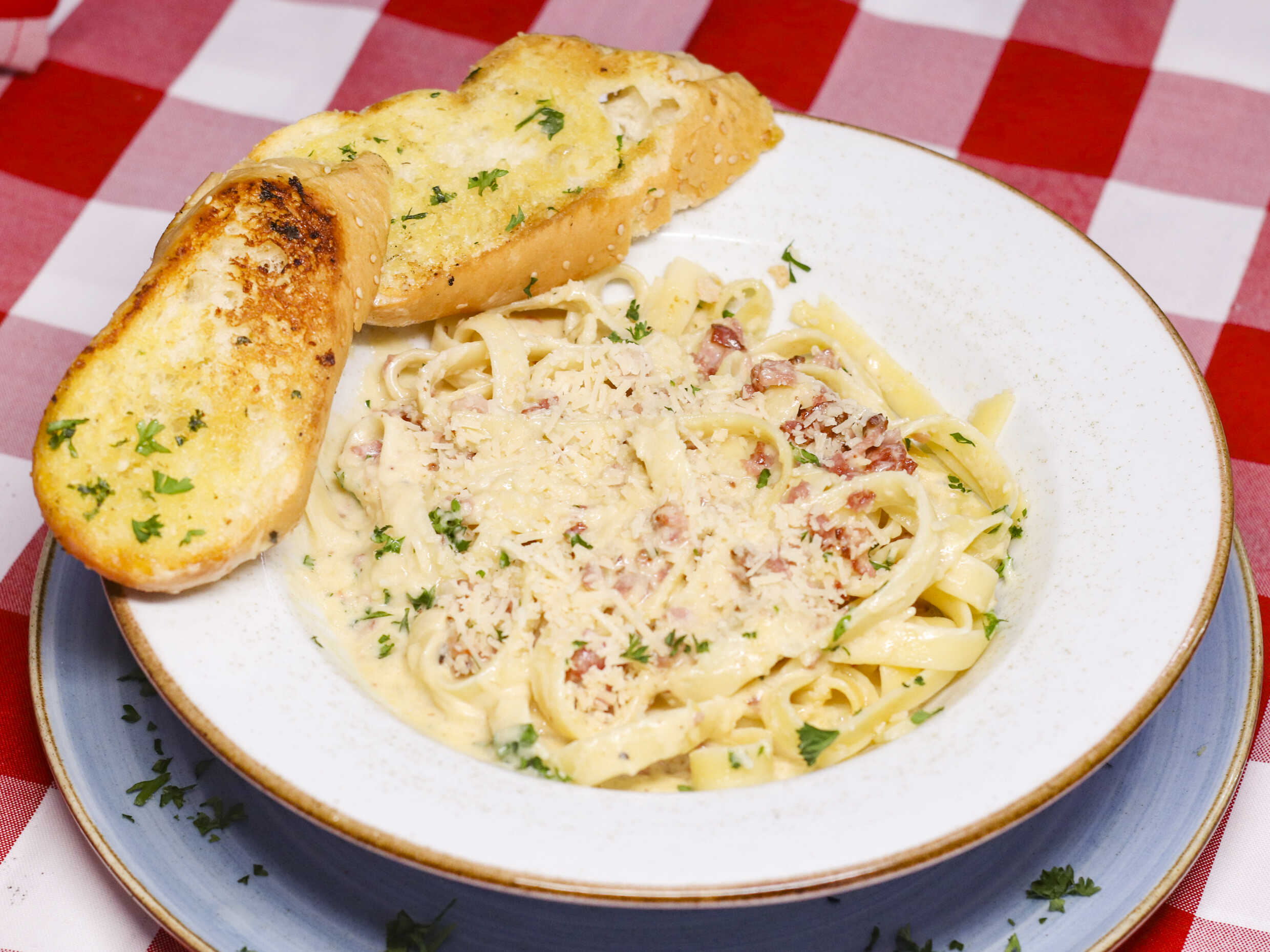 Salchicha Suiza, pollo desmechado, tocineta, pasta de maiz con queso