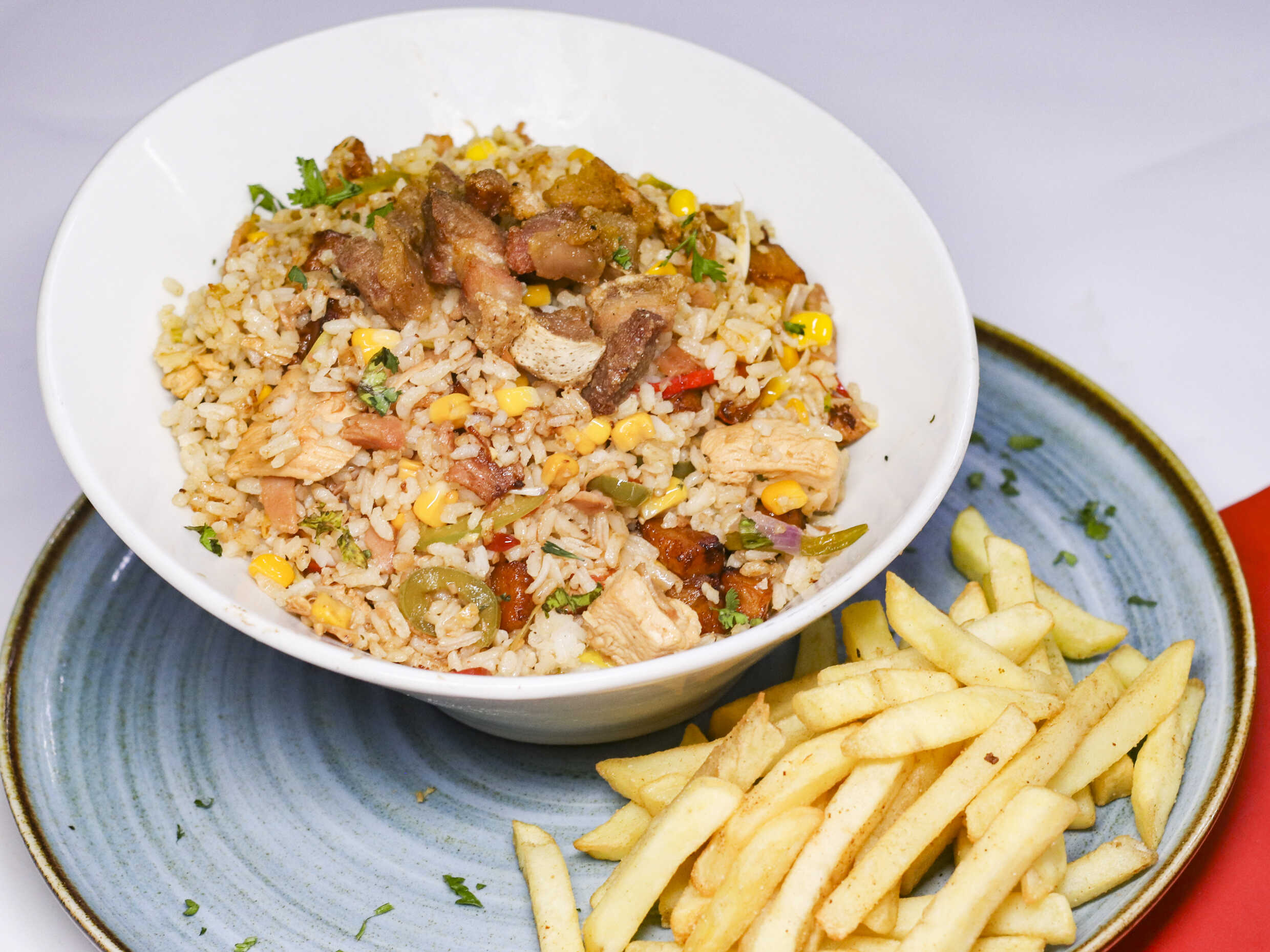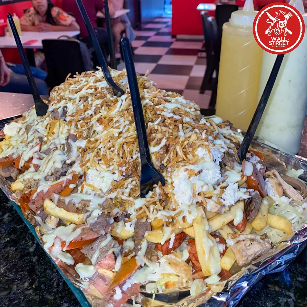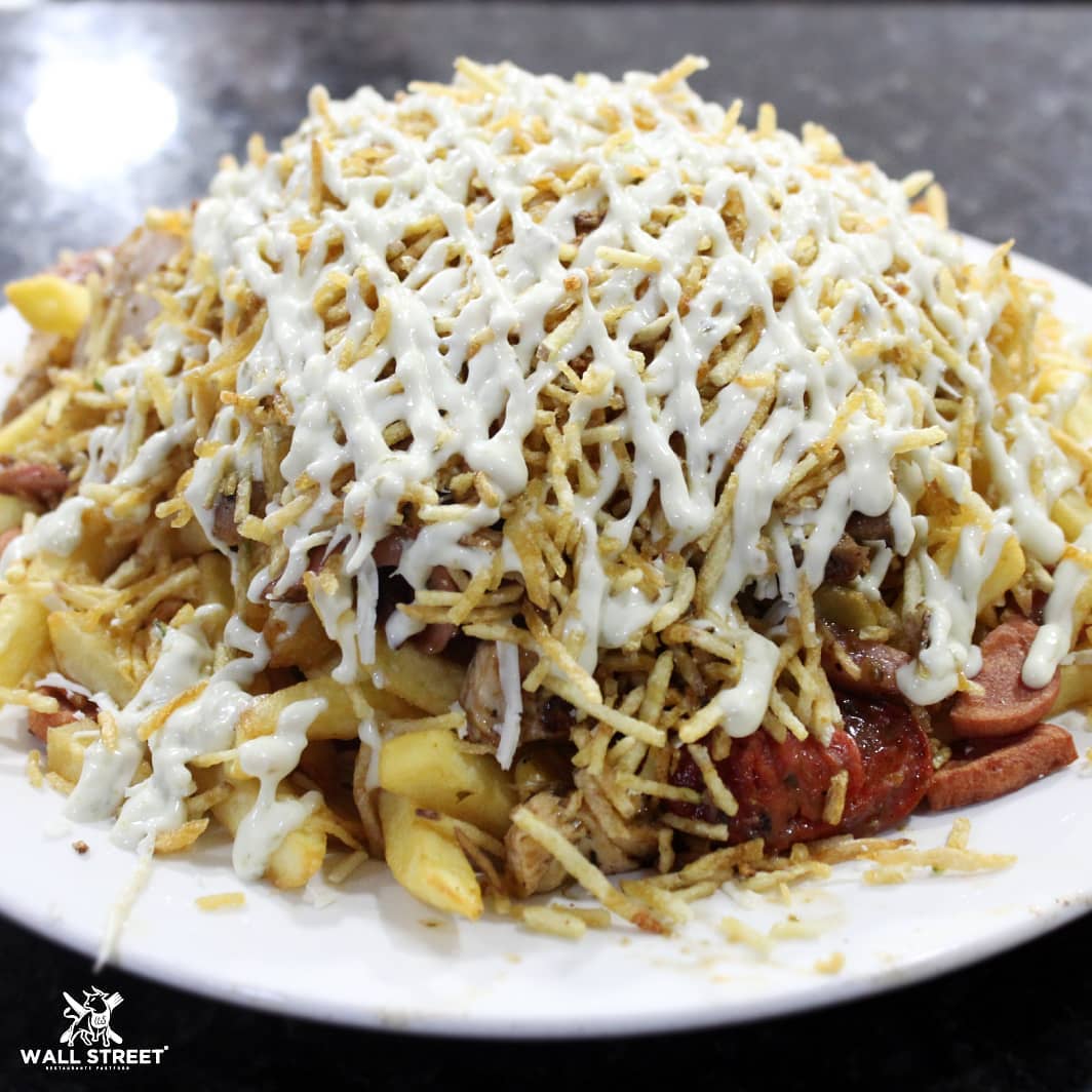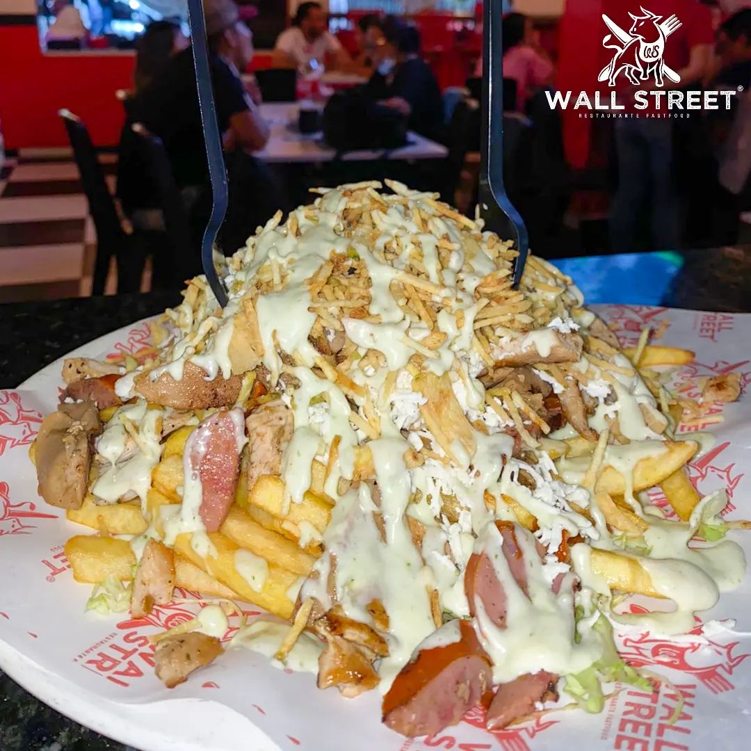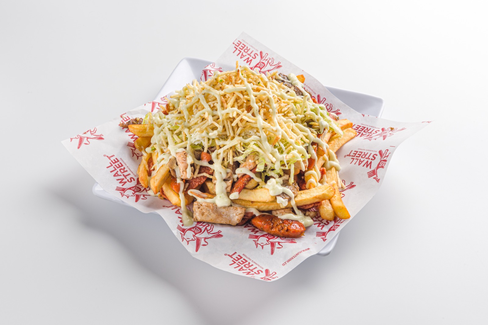 Lomito, pollo, papas francesas, queso costeño, virutas de papa, salchicha manguera, lechuga, salsa tártara de la casa.