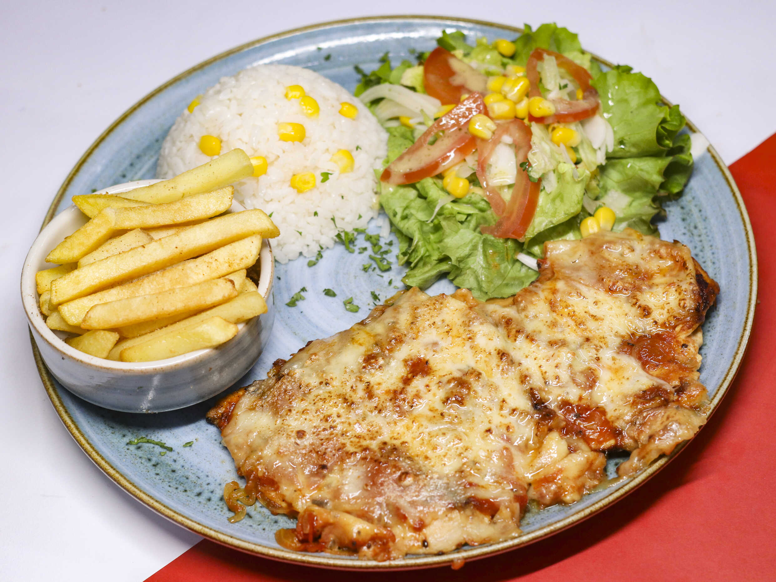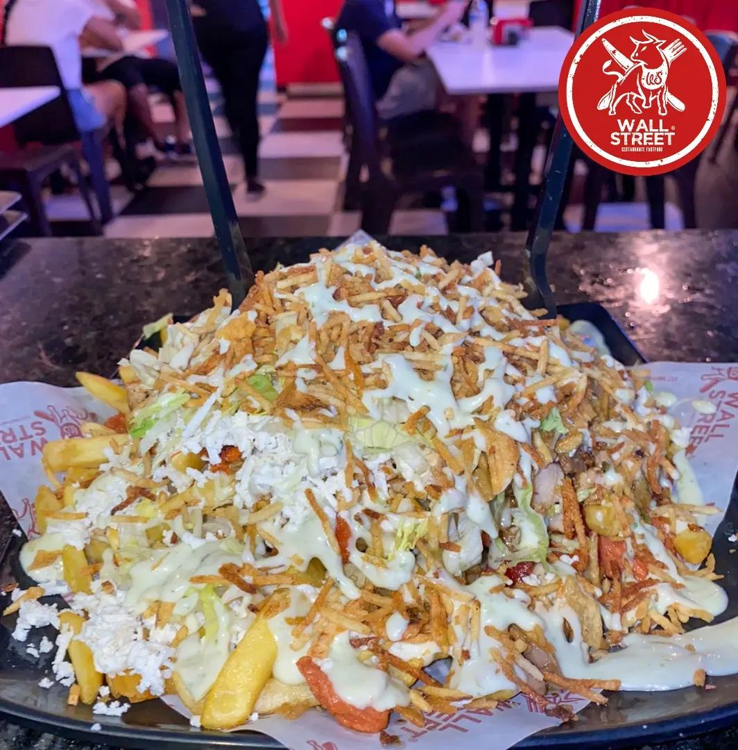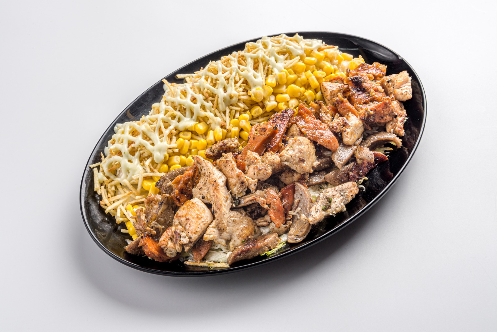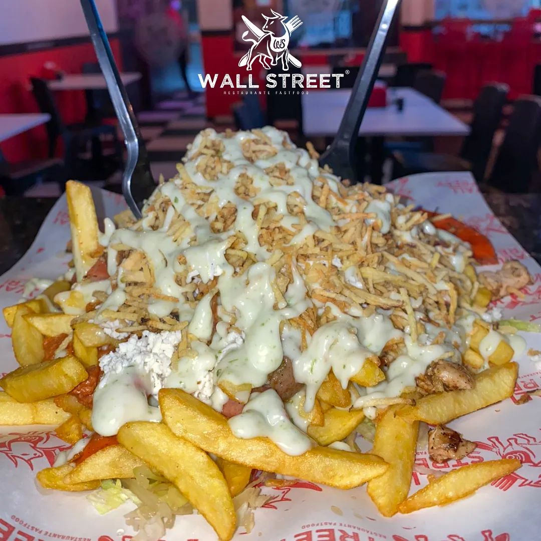 Lomito, pollo, papas francesas, queso costeño, virutas de papa, salchicha manguera, lechuga, salsa tártara de la casa.