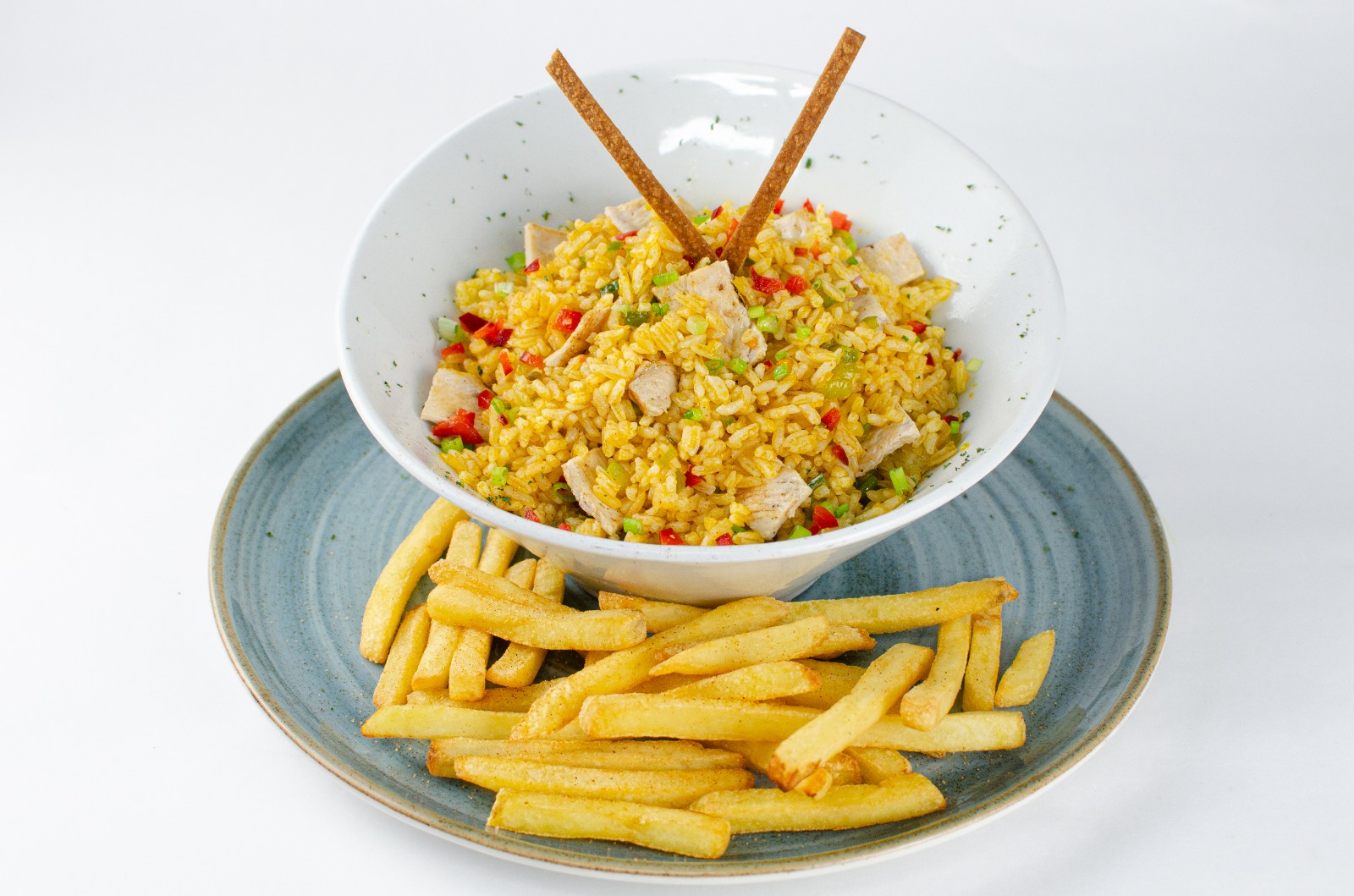 Papas francesas, queso costeño, virutas de papa, pollo, lechuga, salsa tártara de la casa.
