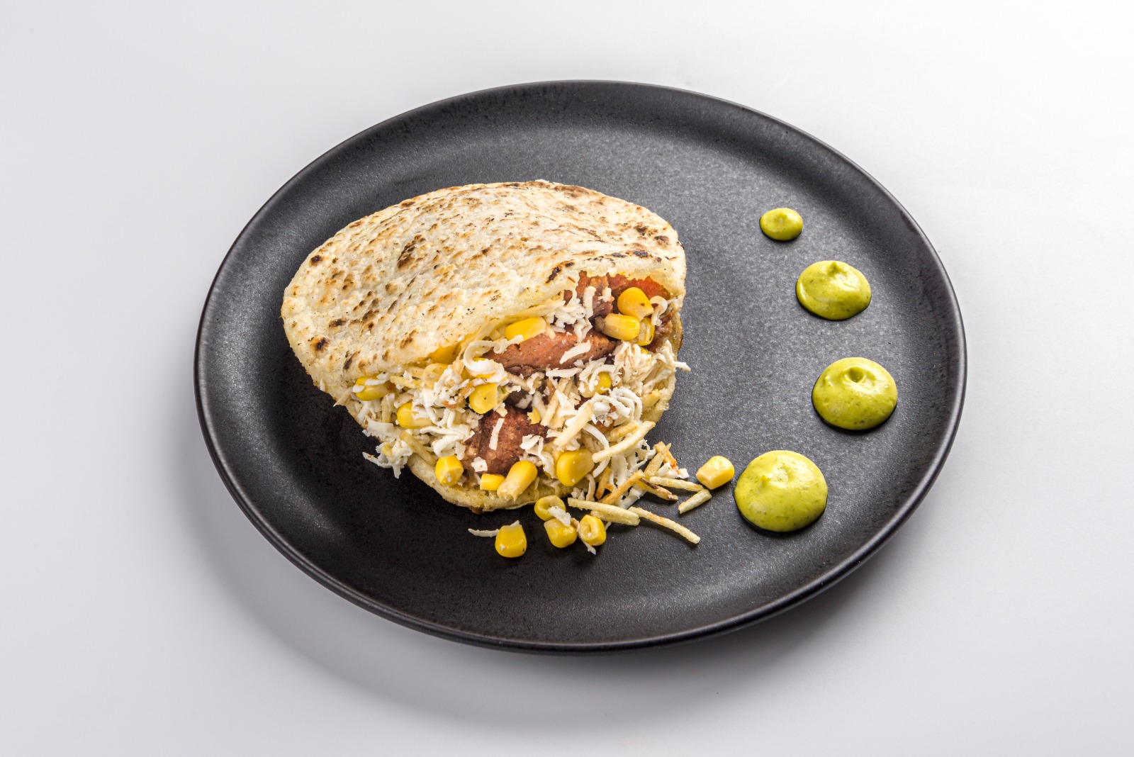 carne, pollo, bollo limpio, queso costeño, virutas de papa, queso mozzarella, maíz, lechuga y salsa tártara.