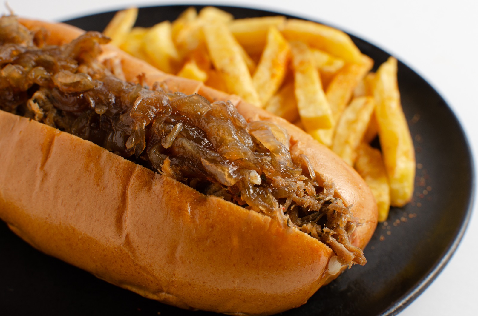 Salchicha Americana,Cebolla Caramelizada, Queso costeño frito,Virutas de papas Salsa de la casa.