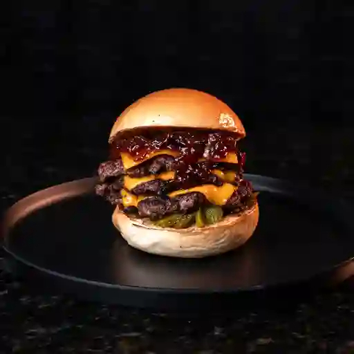 Triple carne angus jugosa, triple queso americano derretido y una explosiva mermelada de tocineta, todo sobre una cama de pepinillos, con tomate fresco y lechuga cogollo, abrazados por un pan brioche dorado y suave, un pecado al que no podrás decirle que no. Acompañado de papas a a francesa