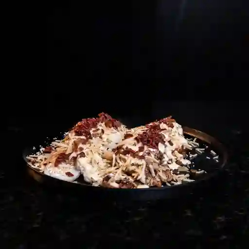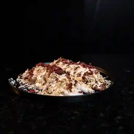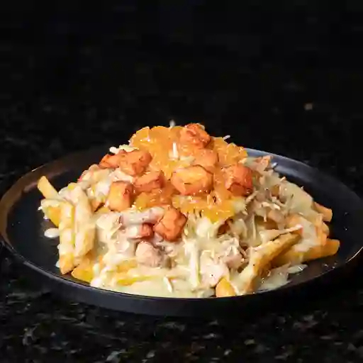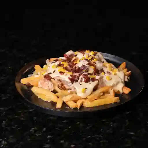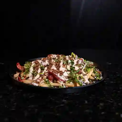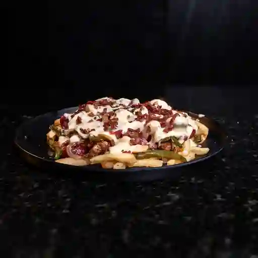 Papas a la francesa bañadas en un mix de queso cheddar y mozzarella fundido, acompañadas de trozos de pollo, lomo de cerdo, carne de hamburguesa de res artesanal, chorizo argentino, salchicha ranchera y adornado con una lluvia de tocineta y salsas de la casa.