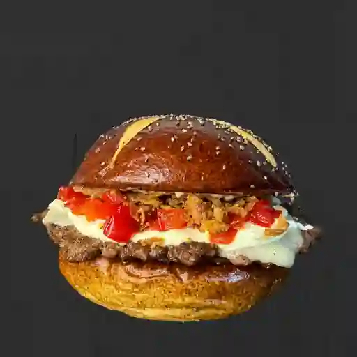 Pan pretzel o brioche, 100 g de carne angus smash, queso mozzarella, queso crema, pimentón caramelizado, coronado con cebolla frita caramelizada y salsa wallace, acompañado de papas a la francesa.