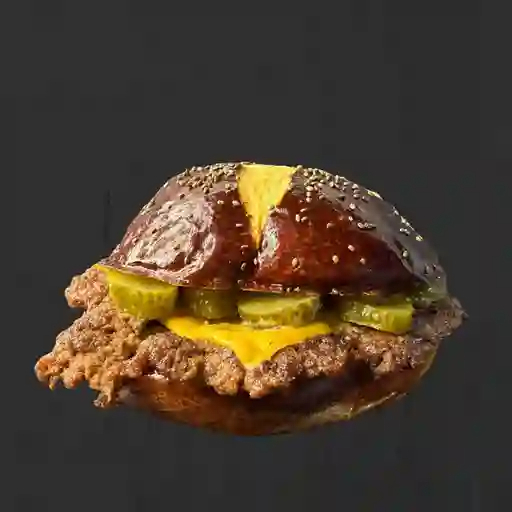 Pan pretzel o brioche, 100 g de carne angus smash, queso cheddar, pepinillos y salsa wallace, acompañado de papas a la francesa.