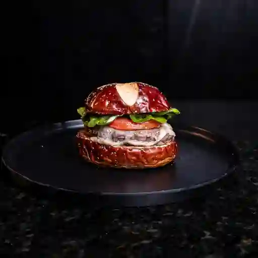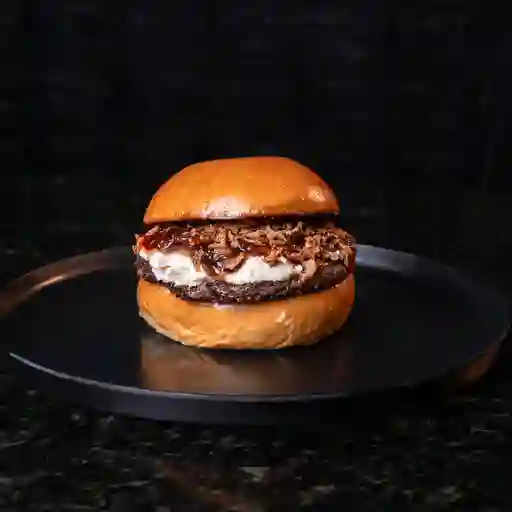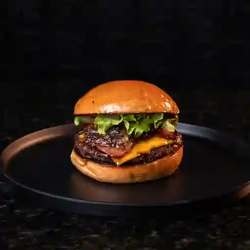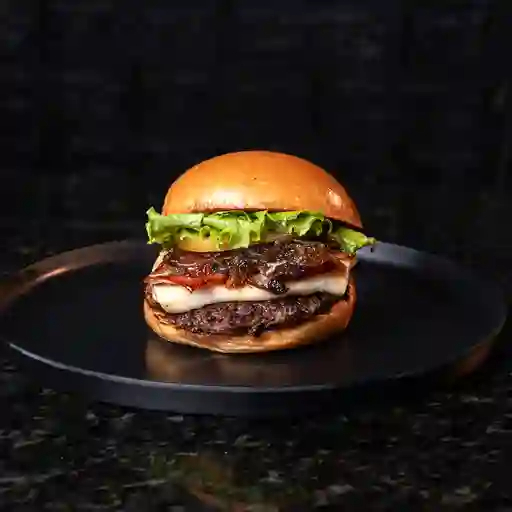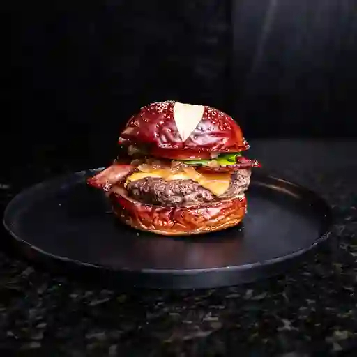 Pan brioche o pretzel, 180 g de carne angus, tocineta, queso costeño asado, cebolla caramelizada y salsas de la casa. Acompañado de papas a a francesa