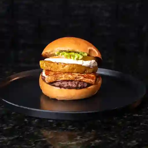 Pan brioche o pretzel, 180 g de carne angus, queso crema, piña asada, queso costeño empanizado, vegetales y salsas de la casa. Acompañado de papas a a francesa