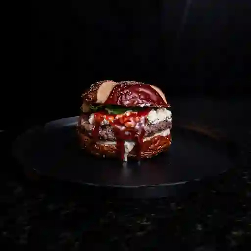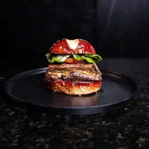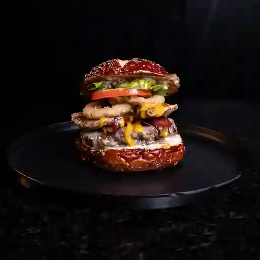 Pan brioche o pretzel, 300 g de carne angus rellena de queso cheddar envuelta en tocineta, queso mozzarella fundido, cebolla caramelizada, vegetales y salsas de la casa, incluye papas.